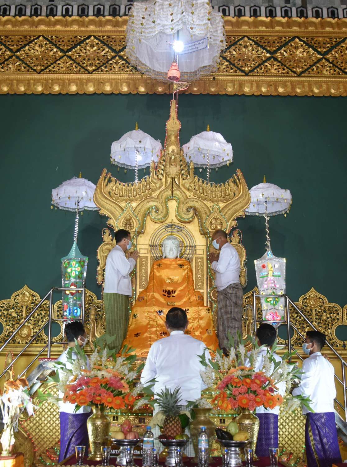 အခမ်းအနားတွင် နေပြည်တော်ကောင်စီဥက္ကဋ္ဌ ဒေါက်တာမောင်မောင်နိုင်က ဥပ္ပါတသန္တိစေတီတော်မြတ်ကြီးလှိုဏ်အတွင်း အရှေ့အရပ်ရှိ မဟာမဏိမယဂေါတမ ဗုဒ္ဓပဋိမာ ရုပ်ပွားတော်မြတ်အားလည်းကောင်း၊ သာသနာရေးနှင့်ယဉ်ကျေးမှုဝန်ကြီးဌာန ဒုတိယဝန်ကြီး ဦးအေးထွန်းက တောင်အရပ်ရှိ မဟာမဏိမယကကုသန္ဓ ဗုဒ္ဓပဋိမာရုပ်ပွားတော်မြတ်အားလည်းကောင်း၊ နေပြည်တော်ကောင်စီအဖွဲ့ဝင် ဦးမြင့်စိုးက အနောက်ရပ်ရှိ မဟာမဏိမယ ကောဏာဂမန ဗုဒ္ဓပဋိမာ ရုပ်ပွားတော်မြတ်အားလည်းကောင်း၊ နေပြည်တော်ကောင်စီ အဖွဲ့ဝင် ဦးဇေယျာလင်းက မြောက်အရပ်ရှိ မဟာမဏိမယကဿပ ဗုဒ္ဓပဋိမာ ရုပ်ပွားတော်မြတ် အားလည်းကောင်း၊ နေပြည်တော် တိုင်းစစ်ဌာနချုပ် ဒုတိယတိုင်းမှူး ဗိုလ်မှူးချုပ် ကျော်စိုးဦးက စေတီတော်ရင်ပြင် အရှေ့မြောက်ထောင့်အရပ်ရှိ မဟာဆုတောင်းပြည့် (ပန်းပေါင်း) ဘုရား အားလည်းကောင်း ဝါဆိုရွှေကြာသင်္ကန်းများ ကပ်လှူကြပြီး ရုပ်ပွားတော်များအား မြသပိတ် ဆွမ်းတော်၊ သစ်သီး၊ ပန်းမန်နှင့် သောက်တော်ရေများ ဆပ်ကပ်ပူဇော်ကြသည်။