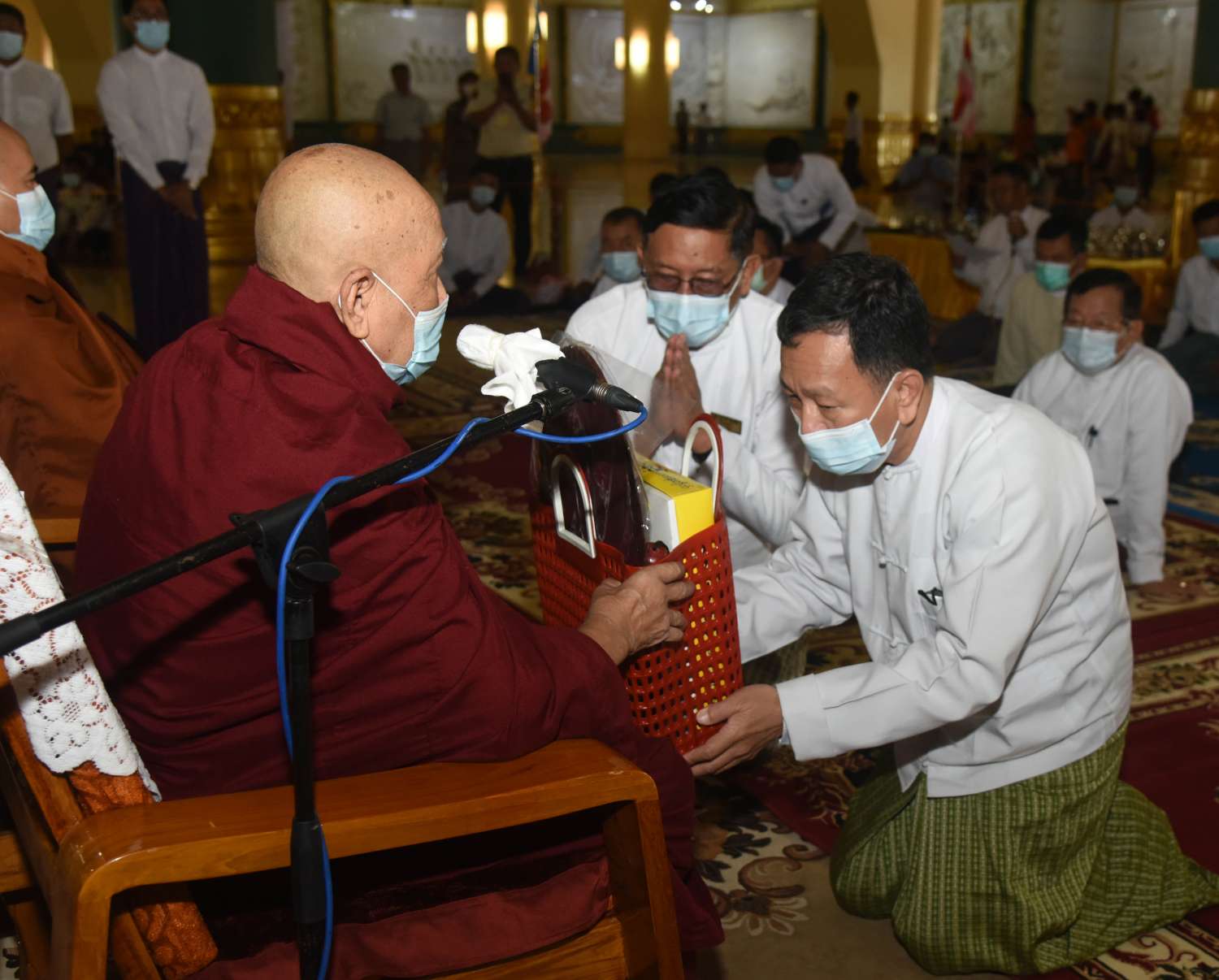 ထို့နောက် နေပြည်တော်ကောင်စီဥက္ကဋ္ဌ၊ ဒုတိယဝန်ကြီးနှင့် အခမ်းအနား တက်ရောက်ကြသူများသည် ဆရာတော်သံဃာတော်များအား ဝါဆိုသင်္ကန်းနှင့် လှူဖွယ်ပစ္စည်းများ ဆက်ကပ်လှူဒါန်းကြကာ ဥပ္ပါတသန္တိစေတီတော်မြတ်ကြီး ဂေါပကအဖွဲ့၏ ဩဝါဒစရိယ၊ နေပြည်တော် လယ်ဝေးမြို့ အင်းသာအရှေ့ကျောင်းတိုက် ပဓာနနာယက ဆရာတော် ဘဒ္ဒန္တ ပဏ္ဍိတထံမှ အနုမောဒနာ တရားနာယူ၍ ရေစက်သွန်းချ အမျှပေးဝေကြပြီး ဆရာတော် သံဃာတော် များအား နေ့ဆွမ်း ဆက်ကပ်လှူဒါန်းခဲ့ကြသည်။