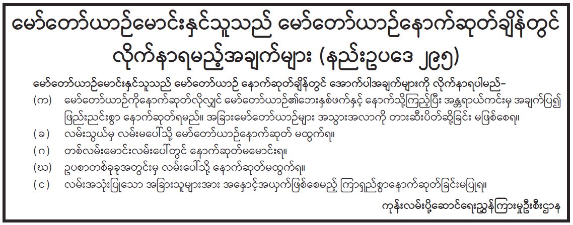 မော်တော်ယာဉ်မောင်းနှင်သူသည် မော်တော်ယာဉ်နောက်ဆုတ်ချိန်တွင် လိုက်နာရမည့် အချက်များ (နည်းဥပဒေ ၂၉၅) 07/17/2022 မော်တော်ယာဉ်မောင်းနှင်သူသည် မော်တော်ယာဉ်နောက်ဆုတ်ချိန်တွင် လိုက်နာရမည့် အချက်များ (နည်းဥပဒေ ၂၉၅)