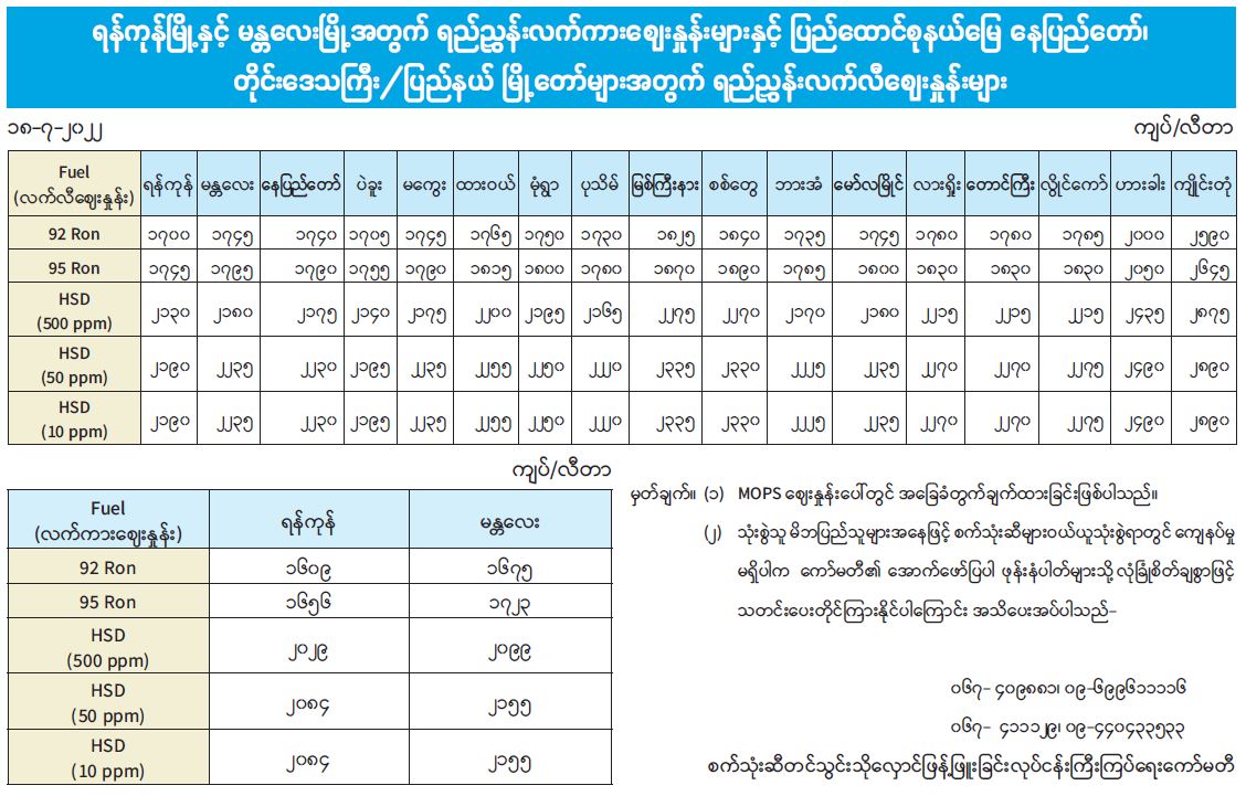 ရန်ကုန်မြို့နှင့် မန္တလေးမြို့အတွက် ရည်ညွှန်းလက်ကားဈေးနှုန်းများနှင့် ပြည်ထောင်စုနယ်မြေ နေပြည်တော်၊ တိုင်းဒေသကြီး/ပြည်နယ် မြို့တော်များအတွက် ရည်ညွှန်းလက်လီဈေးနှုန်းများ 07/18/2022