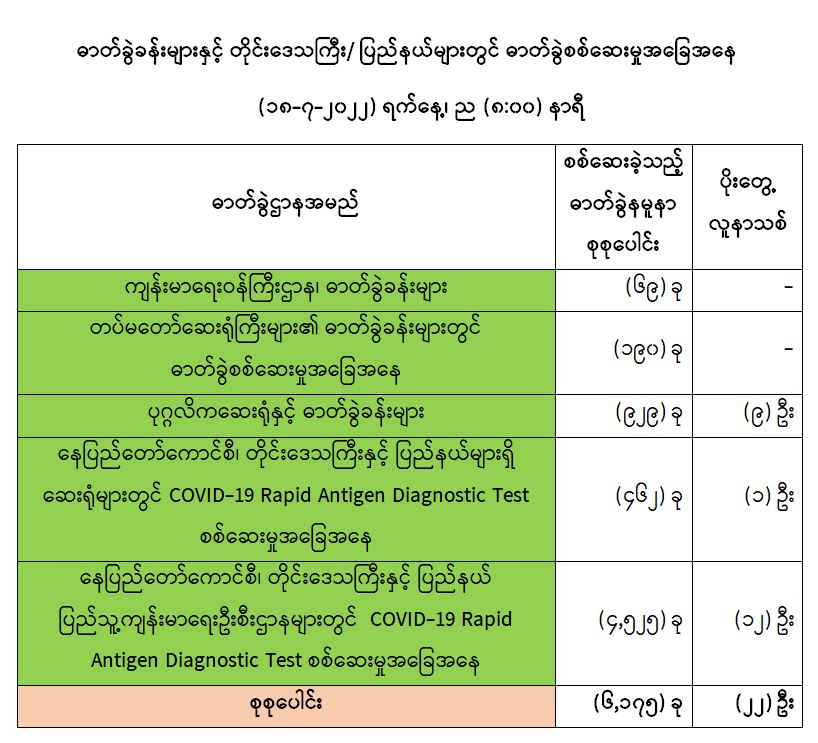 COVID-19 သံသယလူနာများ၊ ဓာတ်ခွဲအတည်ပြုလူနာနှင့် အနီးကပ်ထိတွေ့ခဲ့သူများနှင့် အသွားအလာကန့်သတ်ထားရှိသူများအား COVID-19 ရောဂါ ရှိ/မရှိ ဓာတ်ခွဲစစ်ဆေးခြင်းအား ပုံမှန် ဆောင်ရွက်လျက်ရှိပြီး (၁၇-၇-၂၀၂၂) ရက်နေ့၊ ည (၈:၀၀) နာရီမှ (၁၈-၇-၂၀၂၂) ရက်နေ့၊ ည (၈:၀၀) နာရီအတွင်း ဓာတ်ခွဲနမူနာစုစုပေါင်း (၆,၁၇၅) ခုအား စစ်ဆေးပြီးစီးခဲ့ရာ COVID-19 ရောဂါ ဓာတ်ခွဲ အတည်ပြုလူနာသစ် (၂၂) ဦး တွေ့ရှိရပါသည်။ ထို့ကြောင့် ယနေ့အတွက် ရောဂါပိုးတွေ့ရှိမှု ရာခိုင်နှုန်း မှာ (၀.၃၆) ရာခိုင်နှုန်း ရှိပါသည်။