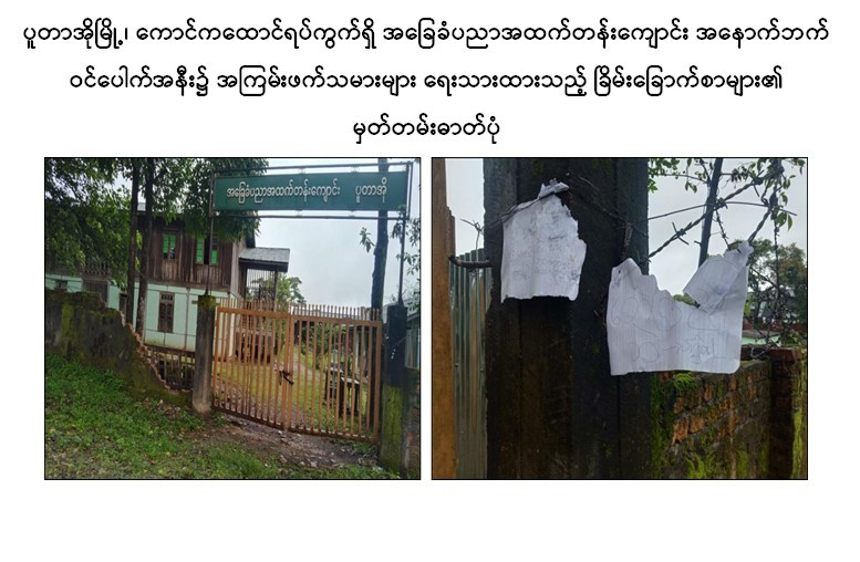 ထို့ပြင် ဇူလိုင် ၁၇ ရက်တွင် ကချင်ပြည်နယ်၊ ပူတာအိုမြို့၊ ကောင်ကထောင် ရပ်ကွက်ရှိ အခြေခံပညာ အထက်တန်းကျောင်း၌လည်းကောင်း၊ ရန်ကုန်တိုင်းဒေသကြီး၊ တာမွေမြို့နယ်၊ ကျောက်မြောင်းအရှေ့ရပ်ကွက်ရှိ အမှတ်(၂)အခြေခံပညာအထက်တန်းကျောင်း၌လည်းကောင်း ကျောင်းတက်ရောက်မှုကို အနှောင့်အယှက်ဖြစ်စေရန် ခြိမ်းခြောက်ဆန့်ကျင်သည့် စာများရေးသားနှောင့်ယှက်ထားသည်ကို တွေ့ရှိရသည်။