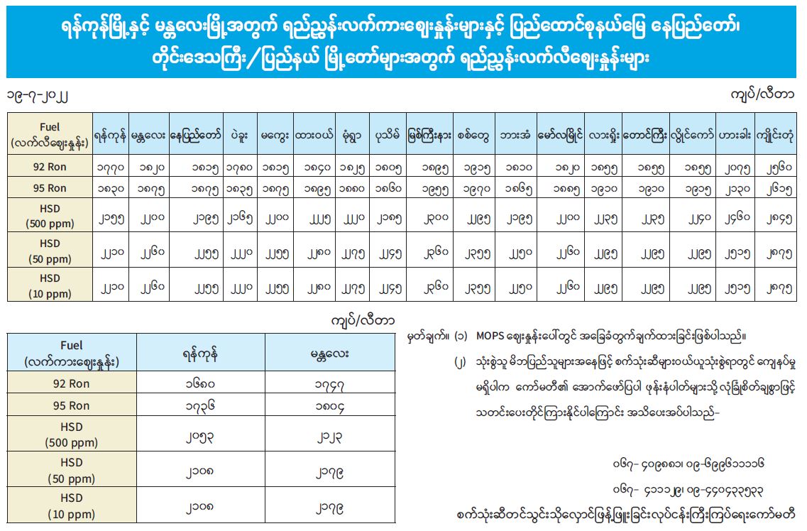 ရန်ကုန်မြို့နှင့် မန္တလေးမြို့အတွက် ရည်ညွှန်းလက်ကားဈေးနှုန်းများနှင့် ပြည်ထောင်စုနယ်မြေ နေပြည်တော်၊ တိုင်းဒေသကြီး/ပြည်နယ် မြို့တော်များအတွက် ရည်ညွှန်းလက်လီဈေးနှုန်းများ 07/19/2022