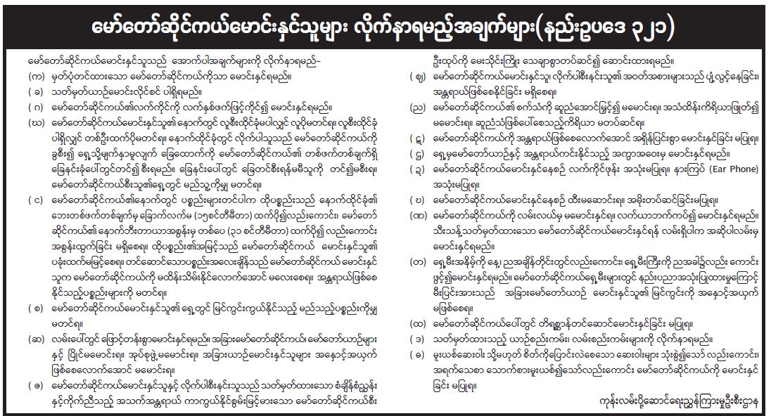 မော်တော်ဆိုင်ကယ်မောင်းနှင်သူများ လိုက်နာရမည့်အချက်များ(နည်းဥပဒေ ၃၂၁)