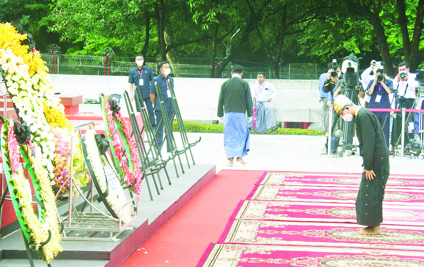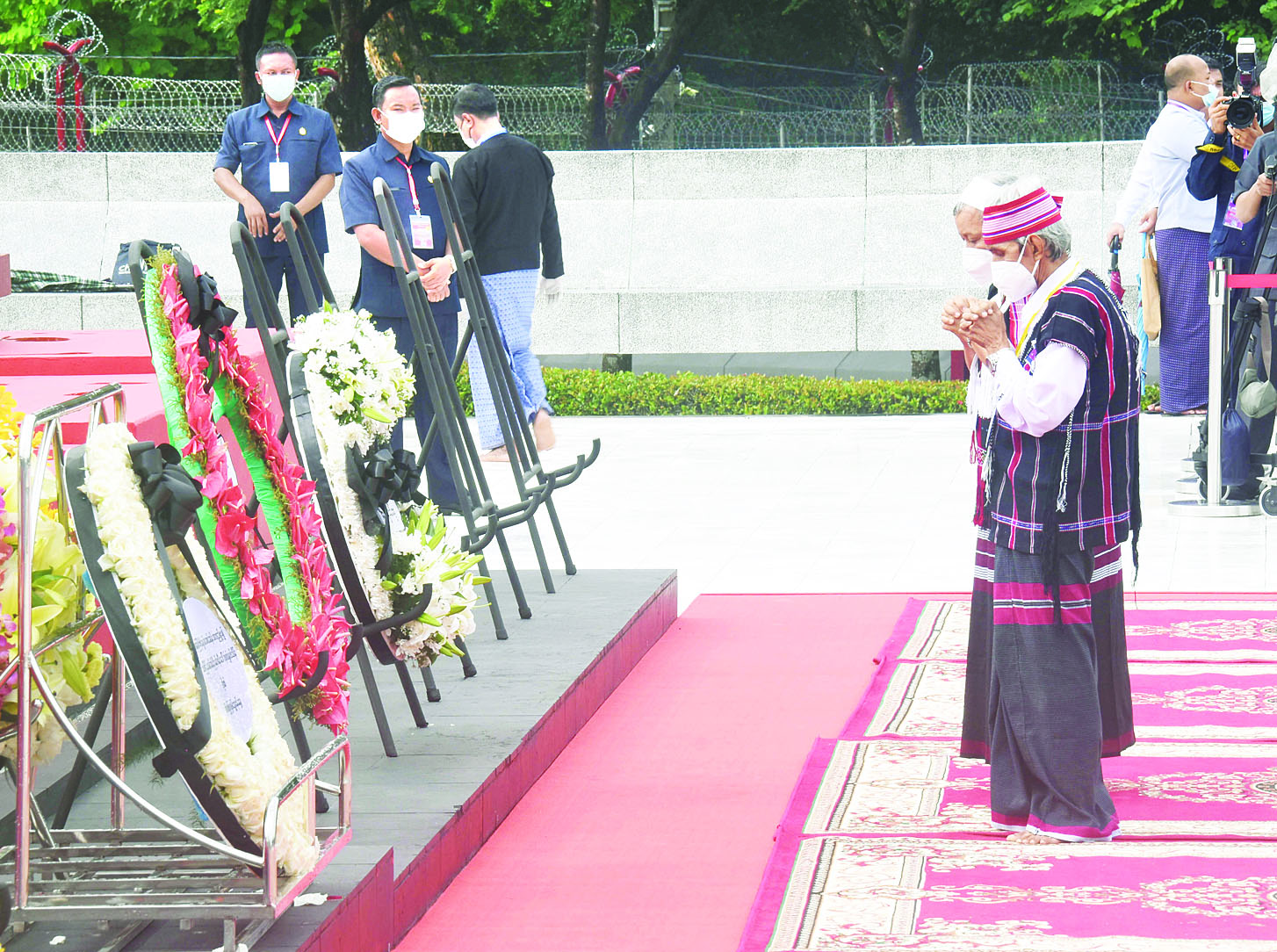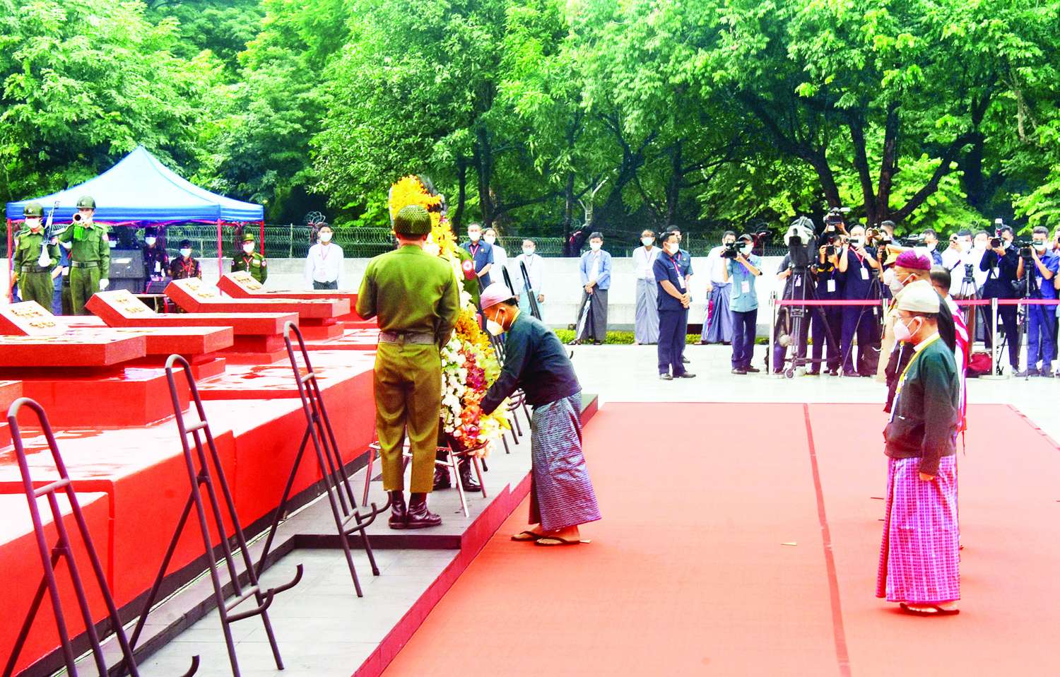 ထို့နောက် နိုင်ငံတော်စီမံအုပ်ချုပ်ရေးကောင်စီ ဒုတိယဥက္ကဋ္ဌ၊ ဒုတိယဝန်ကြီးချုပ်၊ ဒုတိယဗိုလ်ချုပ်မှူးကြီးစိုးဝင်းနှင့် တက်ရောက်လာကြသူများက ဗိုလ်ချုပ်အောင်ဆန်းနှင့်တကွ အာဇာနည်ခေါင်းဆောင်ကြီးများ၏ ဂူဗိမာန်၌ ပြည်ထောင်စုသမ္မတမြန်မာနိုင်ငံတော်၏ လွမ်းသူ့ပန်းခွေကိုချ၍ အလေးပြုကြသည်။