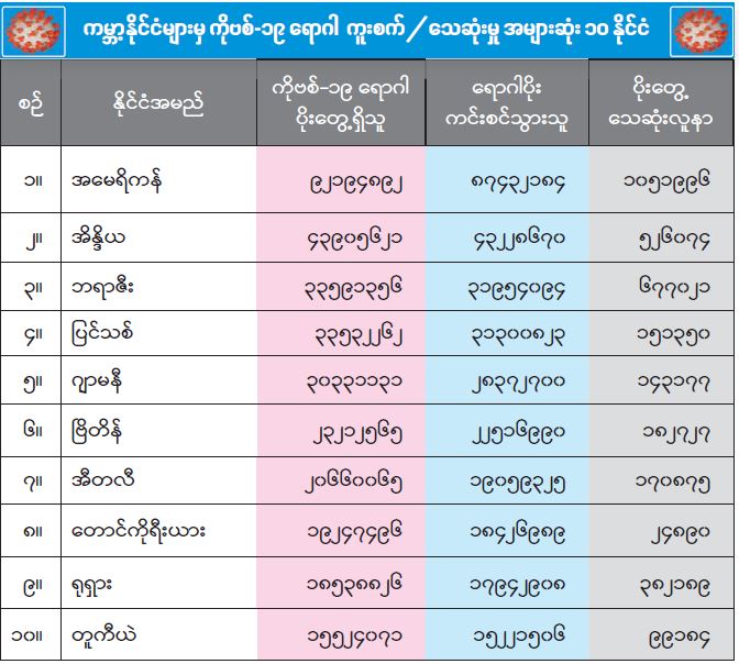 ကမ္ဘာ့နိုင်ငံများမှ ကိုဗစ်-၁၉ ရောဂါ ကူးစက်/သေဆုံးမှု အများဆုံး ၁၀ နိုင်ငံ
