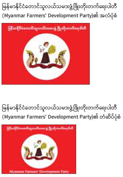 ၃။ သို့ဖြစ်ပါ၍ မြန်မာနိုင်ငံတောင်သူလယ်သမားဖွံ့ဖြိုးတိုးတက်ရေးပါတီ (Myanmar Farmers’ Development Party)က ပြင်ဆင် တင်ပြလာသည့် ဖော်ပြပါပါတီအလံနှင့် တံဆိပ်တို့ကို ကန့်ကွက်လိုက ယခုကြေညာသည့်နေ့မှစ၍ (၇) ရက်အတွင်း ခိုင်လုံသော အထောက်အထားများဖြင့် ပြည်ထောင်စုရွေးကောက်ပွဲကော်မရှင်သို့ ကန့်ကွက်နိုင်ပါကြောင်း နိုင်ငံရေးပါတီများ မှတ်ပုံတင်ခြင်း နည်းဥပဒေ ၁၄ (ဃ)အရ အများသိစေရန် ကြေညာအပ်ပါသည်။