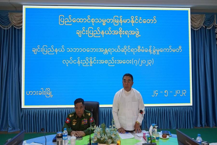 ဦးစွာ ကာကွယ်ရေးဦးစီးချုပ်ရုံး (ကြည်း)မှ ဒုတိယဗိုလ်ချုပ်ကြီး မင်းနိုင်က ပြန်လည်ထူထောင်ရေးလုပ်ငန်းများနှင့်ပတ်သက်၍ အမှာစကားပြောကြားသည်။ ထို့နောက် သက်ဆိုင်ရာကဏ္ဍအသီးသီးမှ တာဝန်ရှိသူများက လုပ်ငန်းဆောင်ရွက်မှု အခြေအနေများနှင့် ပတ်သက်၍ ဆွေးနွေးတင်ပြကြရာ ပြည်နယ်ဝန်ကြီးချုပ်၊ ကာကွယ်ရေးဦးစီးချုပ်ရုံး(ကြည်း)မှ ဒုတိယဗိုလ်ချုပ်ကြီး မင်းနိုင်နှင့် တာဝန်ရှိသူများက တင်ပြချက်များအပေါ် လိုအပ်သည်များ ပေါင်းစပ်ညှိနှိုင်း ဆောင်ရွက်ပေးပြီး လေဘေးသင့်ပြည်သူများအတွက် စားသောက်ဖွယ်ရာ ပစ္စည်းများထောက်ပံ့ပေးအပ်ရာ တာဝန်ရှိသူတစ်ဦးက လက်ခံရယူခဲ့သည်။
