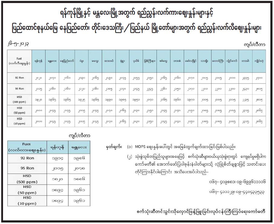 ရန်ကုန်မြို့နှင့် မန္တလေးမြို့အတွက် ရည်ညွှန်းလက်ကားဈေးနှုန်းများနှင့် ပြည်ထောင်စုနယ်မြေ နေပြည်တော်၊ တိုင်းဒေသကြီး/ပြည်နယ် မြို့တော်များအတွက် ရည်ညွှန်းလက်လီဈေးနှုန်းများ 05/26/2023