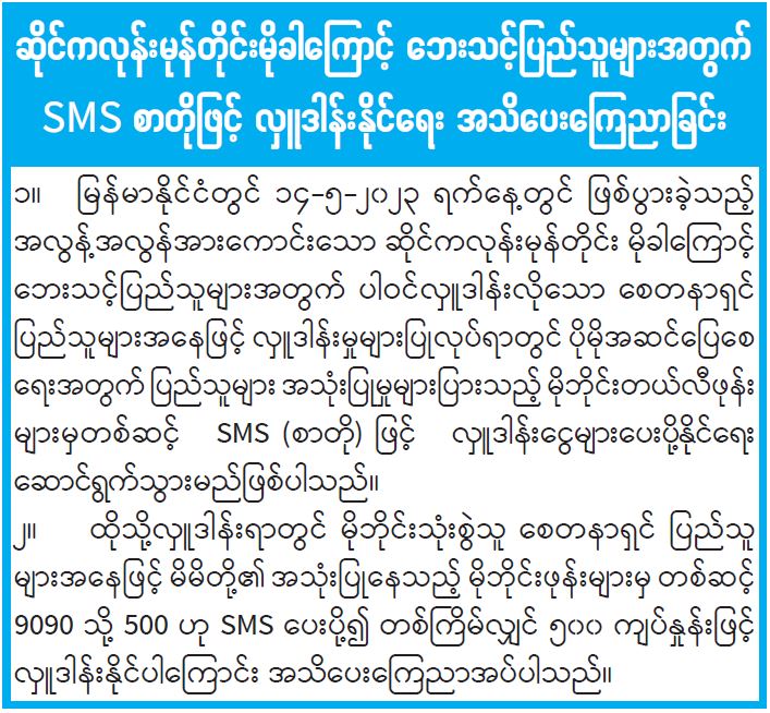 ဆိုင်ကလုန်းမုန်တိုင်း မိုခါကြောင့် ဘေးသင့်ပြည်သူများအတွက် SMS စာတိုဖြင့် လှူဒါန်းနိုင်ရေး အသိပေးကြေညာခြင်း 10/04/2023