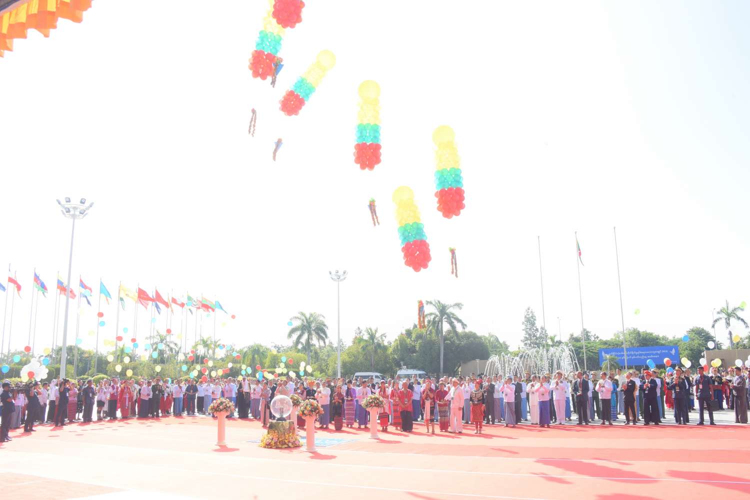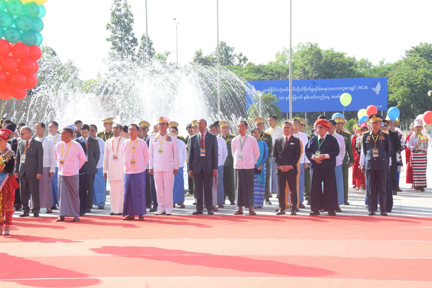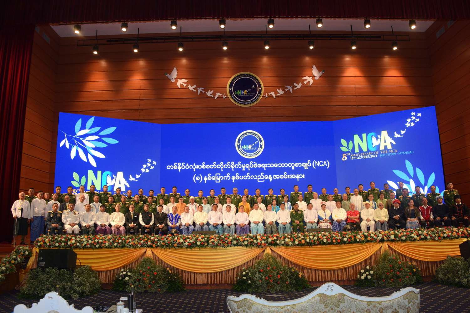 တစ်နိုင်ငံလုံး ပစ်ခတ်တိုက်ခိုက်မှု ရပ်စဲရေး သဘောတူစာချုပ် (NCA) (၈) နှစ်မြောက် နှစ်ပတ်လည်နေ့ အခမ်းအနားကို ယနေ့နံနက်ပိုင်းတွင် နေပြည်တော်ရှိ မြန်မာအပြည်ပြည်ဆိုင်ရာ ကွန်ဗင်းရှင်းဗဟိုဌာန-၂(MICC-2)၌ ကျင်းပရာ နိုင်ငံတော် စီမံအုပ်ချုပ်ရေးကောင်စီဥက္ကဋ္ဌ ၊ နိုင်ငံတော်ဝန်ကြီးချုပ်၊ တပ်မတော်ကာကွယ်ရေးဦးစီးချုပ် ဗိုလ်ချုပ်မှူးကြီး မင်းအောင်လှိုင် နှင့် နိုင်ငံတော်စီမံအုပ်ချုပ်ရေးကောင်စီအဖွဲ့ဝင်များ၊ ပြည်ထောင်စုဝန်ကြီးများ၊ တိုင်းရင်းသား လက်နက်ကိုင်အဖွဲ့အစည်းများမှ ပုဂ္ဂိုလ်များ၊ နိုင်ငံခြားသံရုံးများမှ သံတမန်များ၊ ဌာနဆိုင်ရာအကြီးအကဲများနှင့် အခြားဖိတ်ကြားထားသူများ တက်ရောက်ခဲ့ကြသည်။