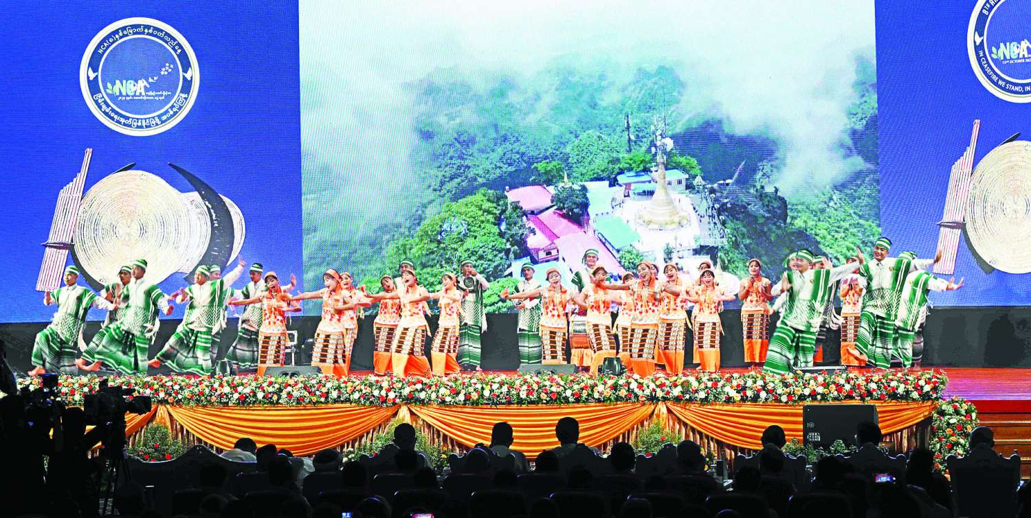 ထို့နောက် နိုင်ငံတော်စီမံအုပ်ချုပ်ရေးကောင်စီဥက္ကဋ္ဌ နိုင်ငံတော်ဝန်ကြီးချုပ် အမျိုးသားစည်းလုံးညီညွတ်ရေးနှင့် ငြိမ်းချမ်းရေးဖော်ဆောင်မှု ဗဟိုကော်မတီဥက္ကဋ္ဌက ပြန်ကြားရေးဝန်ကြီးဌာန မြန်မာ့အသံနှင့်ရုပ်မြင်သံကြား၊ သာသနာရေးနှင့်ယဉ်ကျေးမှုဝန်ကြီးဌာန၊ အနုပညာဦးစီးဌာနတို့မှ အကအဖွဲ့များနှင့် တိုင်းရင်းသားအကအဖွဲ့များကို “ငြိမ်းချမ်းရေး ဂုဏ်ပြုပန်းခြင်း” နှင့် ဂုဏ်ပြုချီးမြှင့်ငွေများ ပေးအပ်ချီးမြှင့်ပြီး တိုင်းရင်းသားအကအဖွဲ့များနှင့်အတူ စုပေါင်းမှတ်တမ်းတင် ဓာတ်ပုံရိုက်သည်။