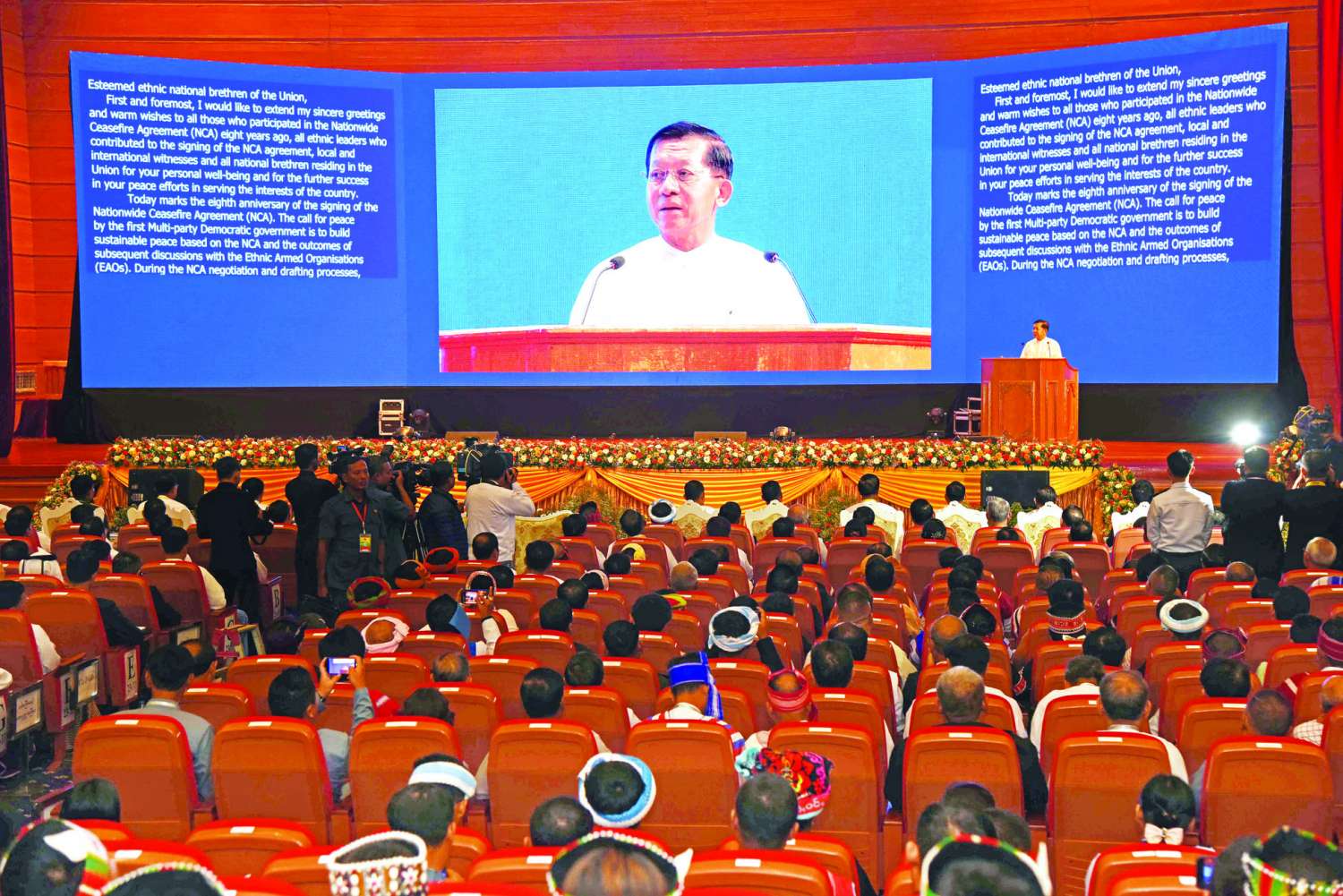 တစ်နိုင်ငံလုံးပစ်ခတ်တိုက်ခိုက်မှုရပ်စဲရေးသဘောတူစာချုပ် (NCA) (၈) နှစ်မြောက် နှစ်ပတ်လည်နေ့ အခမ်းအနားကို ယနေ့နံနက်ပိုင်းတွင် နေပြည်တော်ရှိ မြန်မာအပြည်ပြည်ဆိုင်ရာ ကွန်ဗင်းရှင်းဗဟိုဌာန (၂) (MICC – II) ၌ ကျင်းပပြုလုပ်ရာ နိုင်ငံတော်စီမံအုပ်ချုပ်ရေးကောင်စီဥက္ကဋ္ဌ နိုင်ငံတော်ဝန်ကြီးချုပ် အမျိုးသားစည်းလုံးညီညွတ်ရေးနှင့် ငြိမ်းချမ်းရေးဖော်ဆောင်မှု ဗဟိုကော်မတီဥက္ကဋ္ဌ တပ်မတော်ကာကွယ်ရေးဦးစီးချုပ် ဗိုလ်ချုပ်မှူးကြီး မင်းအောင်လှိုင် တက်ရောက်မိန့်ခွန်းပြောကြားသည်။