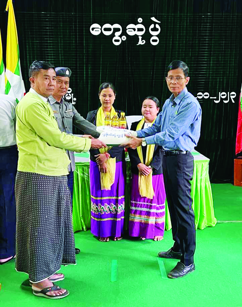ယင်းနောက် အသေးစား စက်မှုလက်မှုဦးစီးဌာန၏ အသေးစားကုန်ထုတ်လုပ်မှုများ ဖန်တီးပေးနိုင်ရေးနှင့် ကျေးလက်နေမိသားစုဝင်ငွေတိုးစီမံကိန်းအရ ဖွင့်လှစ်ခဲ့သော သင်တန်းများတွင် ထူးချွန်ဆုရသူများအား လုပ်ငန်းသုံးပစ္စည်း ထောက်ပံ့ပေးအပ်ခြင်း အခမ်းအနားကို အဆိုပါခန်းမ၌ ဆက်လက်ကျင်းပပြီး ဒုတိယဝန်ကြီးနှင့် တာဝန်ရှိသူများက ယန်းလောကျေးရွာ အပ်ချုပ်စက်သင်တန်းတွင် ထူးချွန်ဆုရသူငါးဦးကို အပ်ချုပ်စက်၊ ဘီတင်စက်၊ ဓားစက်၊ ထုပ်ရိုက်စက်နှင့် မီးပူ အပါအဝင် ပစ္စည်းခုနစ်မျိုးစီကိုလည်းကောင်း၊ ယန်းကျိန်ကျေးရွာ ဝါးလက်မှုထည်သင်တန်းမှ ထူးချွန်သူငါးဦးကို ဝါးဖြတ်စက် (Miter Saw)၊ ကော်ပတ်အထိုင်စက် (Sandar)၊ Power Art Motor ၊ ဝါးပြုတ်ရန်စတီးကန်၊ လက်ကိုင်ဖောက်စက်၊ လက်ကိုင်ဖြတ်စက်၊ ဝါးဖြတ်ခုံ၊ ဦးထုပ်ခေါင်းချိုးမိုတို့ကိုလည်းကောင်း ထောက်ပံ့ပေးအပ်ရာ သင်တန်းသူများက လက်ခံယူကြသည်။