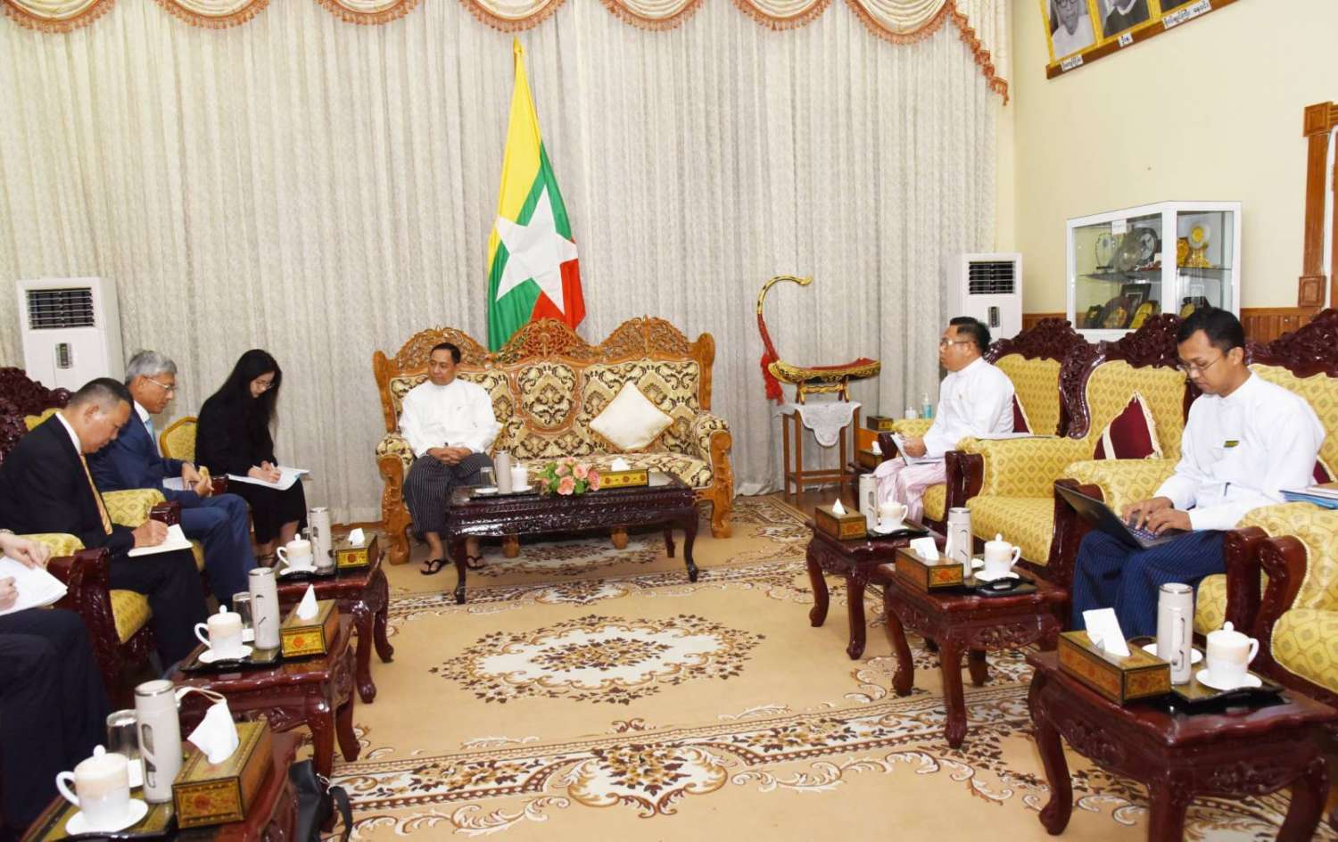 နိုင်ငံတော်စီမံအုပ်ချုပ်ရေးကောင်စီအဖွဲ့ဝင်၊ ပြည်ထဲရေးဝန်ကြီးဌာန ပြည်ထောင်စုဝန်ကြီး၊ အမျိုးသားစည်းလုံးညီညွတ်ရေးနှင့် ငြိမ်းချမ်းရေးဖော်ဆောင်မှု ညှိနှိုင်းရေးကော်မတီ ဥက္ကဋ္ဌ ဒုတိယ ဗိုလ်ချုပ်ကြီး ရာပြည့် က မြန်မာနိုင်ငံဆိုင်ရာ တရုတ်ပြည်သူ့သမ္မတနိုင်ငံသံအမတ်ကြီး H.E. Mr. Chen Hai အား ၁၄-၁၁-၂၀၂၃ ရက်နေ့ ၁၀၀၀ နာရီတွင် နေပြည်တော်၊ ရုံးအမှတ်(၁၀)၊ ပြည်ထဲရေးဝန်ကြီးဌာန၊ ပြည်ထောင်စုဝန်ကြီး၏ဧည့်ခန်းမ၌ လက်ခံတွေ့ဆုံခဲ့ပါသည်။