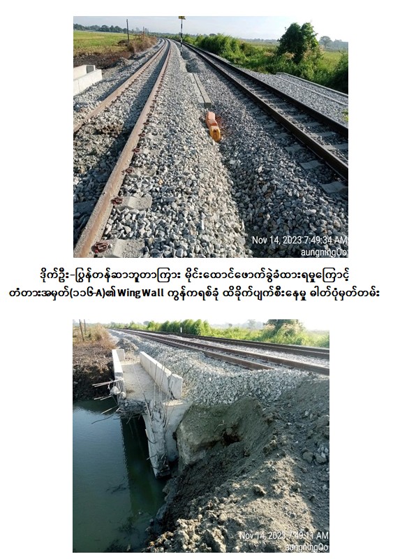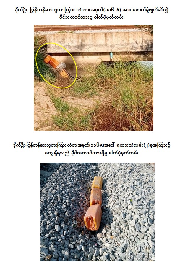 ရန်ကုန် - မန္တလေးရထားလမ်းမကြီး၏ ဒိုက်ဦးဘူတာနှင့် ပြွန်တန်ဆာဘူတာအကြား မိုင်တိုင် ၈၅/၁-၂ ရှိ တံတားအမှတ်(၁၁၆/A) အနီး ယနေ့နံနက် ၇ နာရီခွဲခန့်တွင် အကြမ်းဖက်များက ရထားလမ်းအား မိုင်းထောင်ဖောက်ခွဲဖျက်စီးမှုကြောင့် တံတားအစွန်ကွန်ကရစ်ခုံ ၃ ပေပတ်လည်ခန့်ပျက်စီးခဲ့ပြီး စစ်ဆေးမှုများ ဆက်လက်ဆောင်ရွက်ခဲ့ရာ တံတားပေါ် သံလမ်းနှစ်ခုကြား ပလပ်စတစ်ကော်ပုံးနှင့်ထည့်ထားသည့် လက်လုပ်မိုင်း (၃)လုံးနှင့် တံတားအောက်တွင် လက်လုပ်မိုင်း(၄)လုံးအား တွေ့ရှိခဲ့သဖြင့် သက်မဲ့ပြုလုပ်သိမ်းဆည်းခဲ့ကြောင်း သိရှိရသည်။