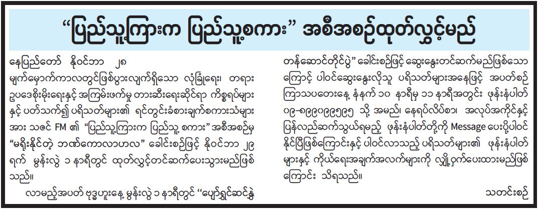 "ပြည်သူကြားက ပြည်သူ့စကား" အစီအစဉ်ထုတ်လွှင့်မည်