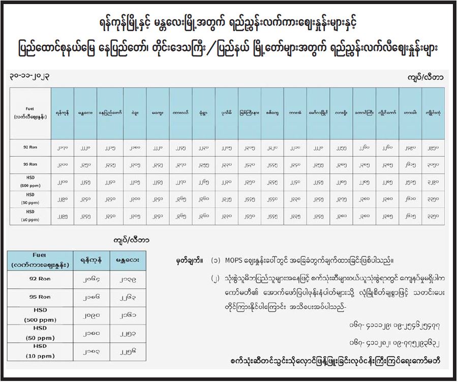 ရန်ကုန်မြို့နှင့် မန္တလေးမြို့အတွက် ရည်ညွှန်းလက်ကားဈေးနှုန်းများနှင့် ပြည်ထောင်စုနယ်မြေ နေပြည်တော်၊ တိုင်းဒေသကြီး/ပြည်နယ် မြို့တော်များအတွက် ရည်ညွှန်းလက်လီဈေးနှုန်းများ 11/30/2023