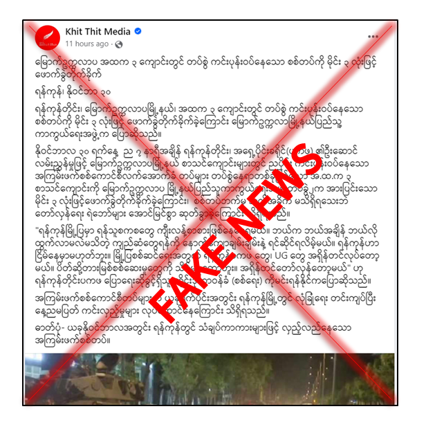 ရန်ကုန်တိုင်းဒေသကြီး၊ မြောက်ဥက္ကလာပမြို့နယ်၊ အမှတ်(၃)အခြေခံပညာအထက် တန်းကျောင်းတွင် ကင်းပုန်းဝပ်နေသော လုံခြုံရေးတပ်ဖွဲ့ဝင်များအား နိုဝင်ဘာလ ၃၀ ရက် ည ၇ နာရီအချိန် မိုင်း ၃ လုံးဖြင့် ဖောက်ခွဲ တိုက်ခိုက်ခဲ့သည်ဟု တရားမဝင် ပြည်ဖျက် မီဒီယာ ရန်ကုန်ခေတ်သစ်မှ မဟုတ်မမှန် သတင်းတု သတင်းအမှားများကို လူမှုကွန်ရက် စာမျက်နှာတွင် ရေးသားဖြန့်ဝေလျက်ရှိသည်ကို တွေ့ရှိရသည်။