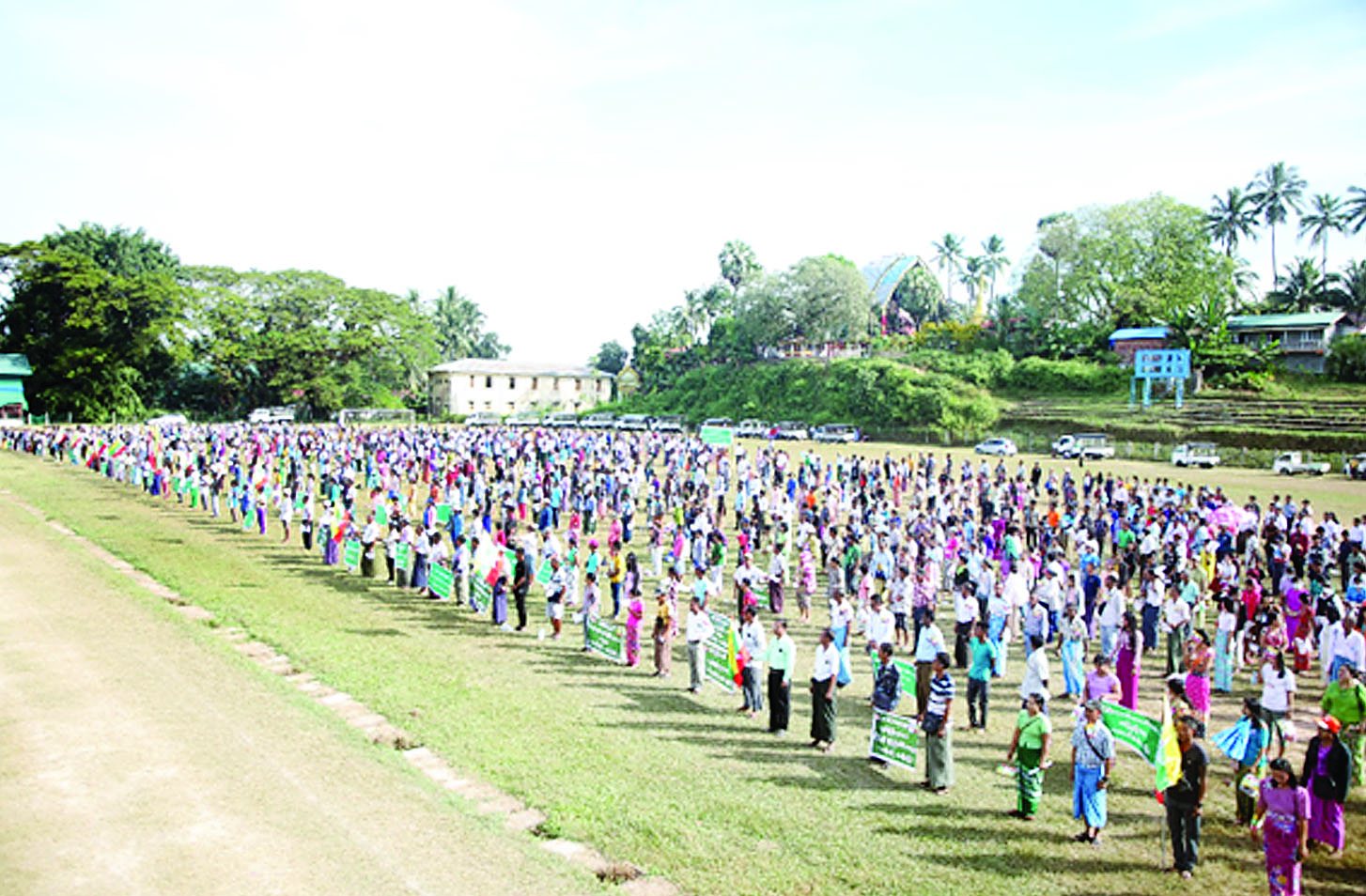 ၎င်းနောက် “အမျိုးဘာသာသာသနာကို စောင့်ရှောက်ပေးသော တပ်မတော်အားထောက်ခံပါသည်၊ တပ်နှင့်ပြည်သူအတူတူ သွေးခွဲလာသူဒို့ရန်သူ၊ ရှေ့တန်းရောက်တပ်မတော်သားများကျန်းမာပါစေ၊ ပြည်သူတို့၏ အကျိုးအမှန်ဖော်ဆောင်သည့် တပ်မတော်ကိုထောက်ခံပါသည်၊ တရားသောစစ်အောင်ရမည်၊ အစဉ်အလာကောင်းတဲ့တပ်မတော် ဒို့တပ်မတော်၊ မြန်မာ့တပ်မတော်အား အပြည့်အဝထောက်ခံအပ်ပါသည်၊ အကြမ်းဖက် PDF များ ကျဆုံးပါစေ၊ စွန့်လွှတ်စွန့်စား တပ်မတော်သားများ အောင်မြင်ပါစေ၊ KIA အလိုမရှိ၊ TNLA အလိုမရှိ၊ MNDAA အလိုမရှိ၊ AA အလိုမရှိ၊ PDF အလိုမရှိ” စသည့် ကြွေးကြော်သံများကို သံပြိုင်ကြွေးကြော်ခဲ့ကြပြီး အခမ်းအနားကိုရုတ်သိမ်းခဲ့ကြောင်း သတင်းရရှိသည်။