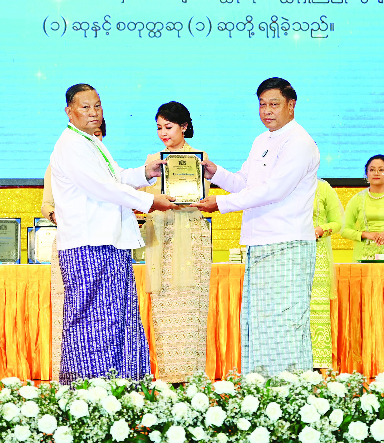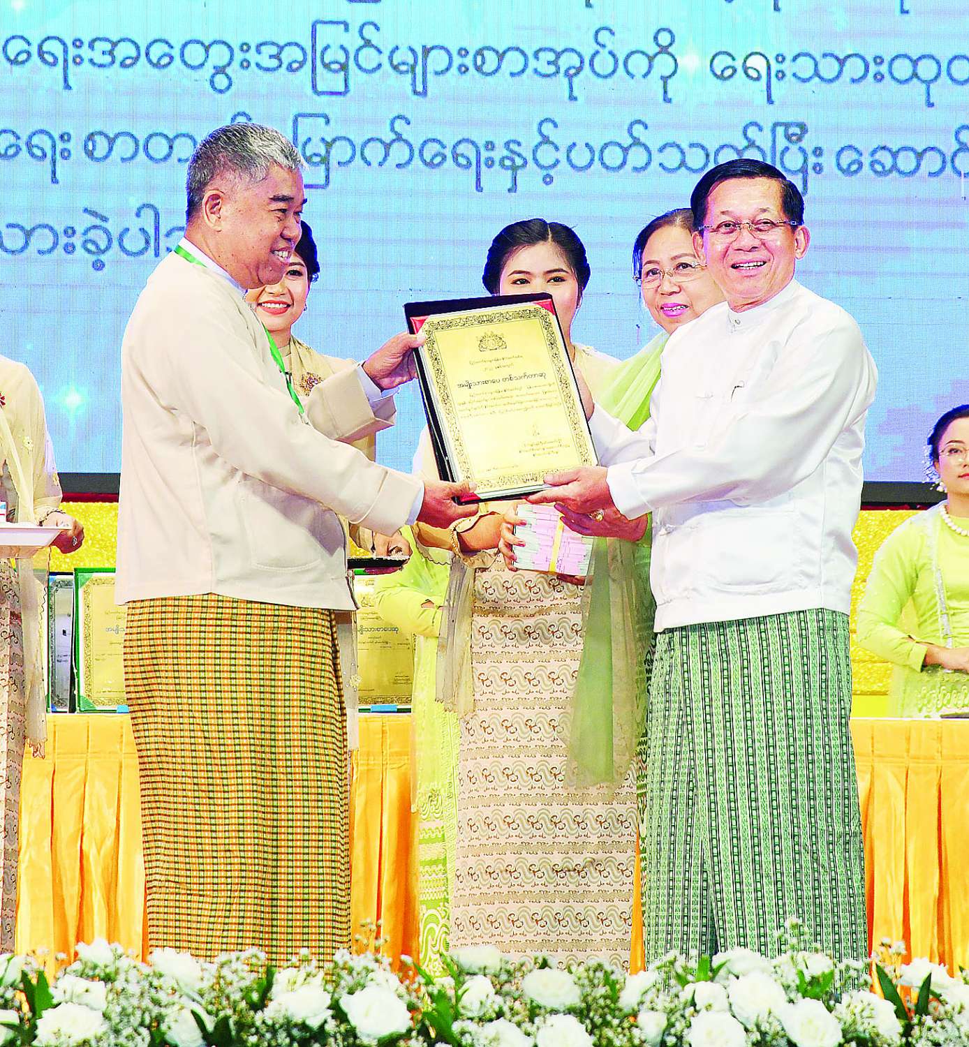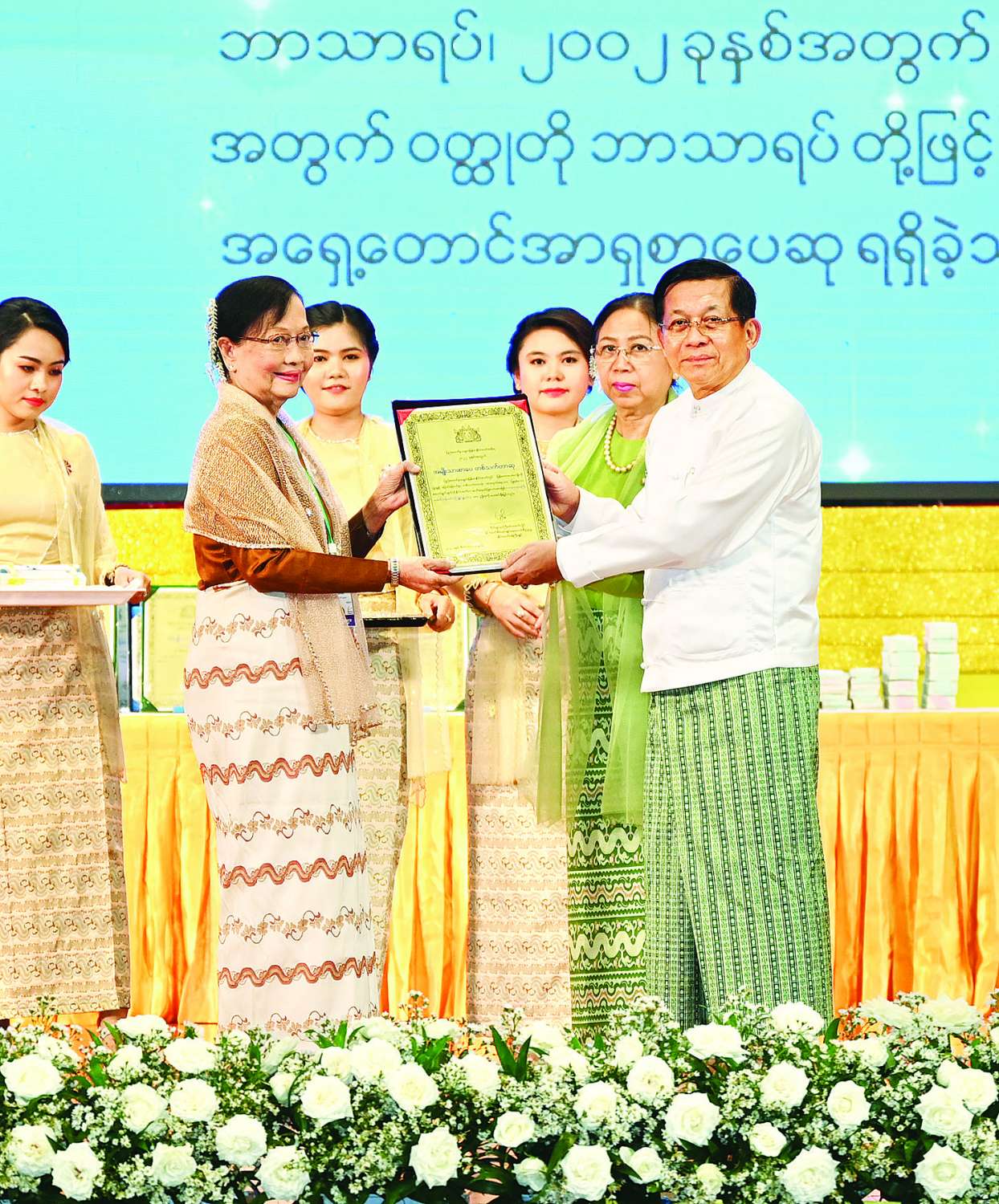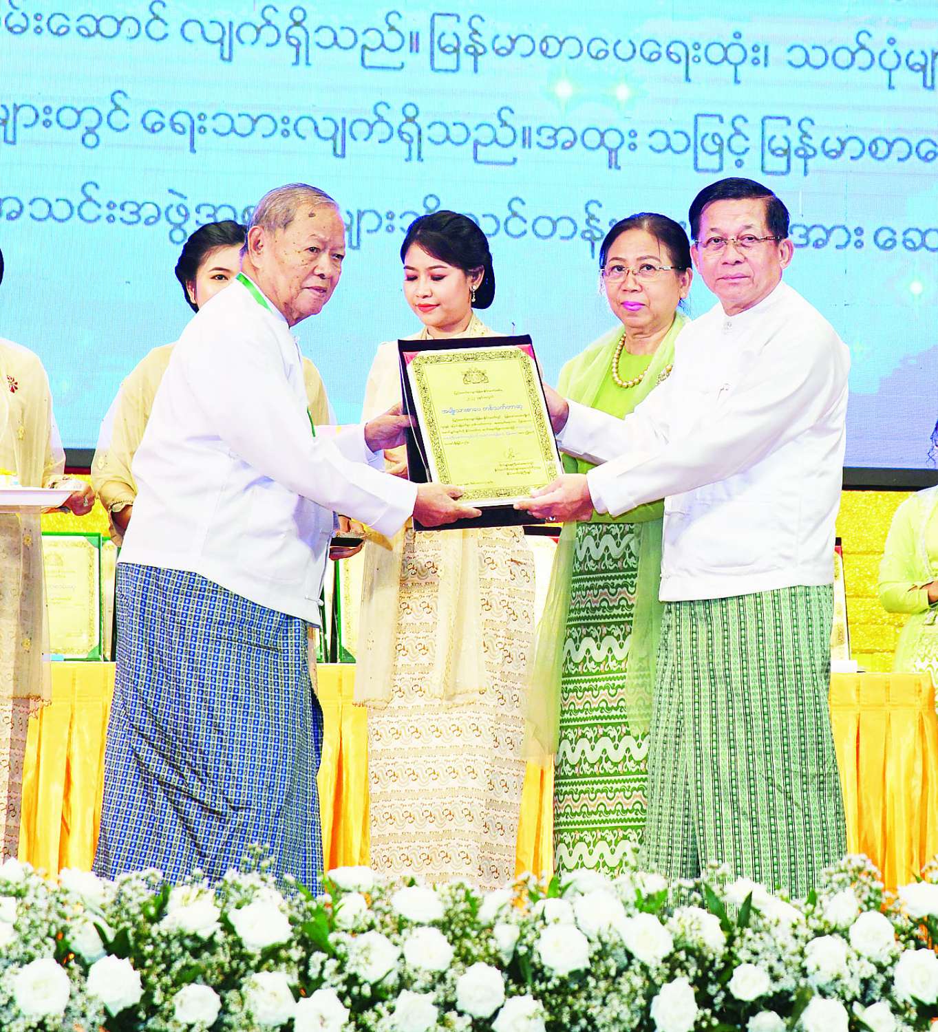 ယင်းနောက် နိုင်ငံတော်စီမံအုပ်ချုပ်ရေးကောင်စီ ဥက္ကဋ္ဌ နိုင်ငံတော်ဝန်ကြီးချုပ်နှင့်ဇနီးတို့က ၂၀၂၂ခုနှစ်၊ အမျိုးသားစာပေတစ်သက်တာဆု ရရှိကြသည့် စာပေပညာရှင်ဆရာကြီး ဒေါက်တာထွန်းတင့် (ဒေါက်တာ ထွန်းတင့်-မြန်မာစာ)၊ စာပေပညာရှင်ဆရာကြီး ဒေါက်တာချစ်စံ (ချစ်စံဝင်း)၊ စာပေပညာရှင် ဆရာမကြီး ဒေါ်ခင်သန်းဝင်း (ကြူကြူသင်း)၊ စာပေပညာရှင် ဆရာကြီး ဒေါက်တာသန်းဦး (ပြည်စိုးမင်း)ကိုယ်စား သန်းဦးဖောင်ဒေးရှင်း အတွင်းရေးမှူး ဦးအေးကြိုင်တို့ကို ဆုတံဆိပ်များ၊ ဂုဏ်ပြုချီးမြှင့်ငွေနှင့် အမှတ်တရဂုဏ်ပြုလက်ဆောင်များ ပေးအပ်ချီးမြှင့်သည်။