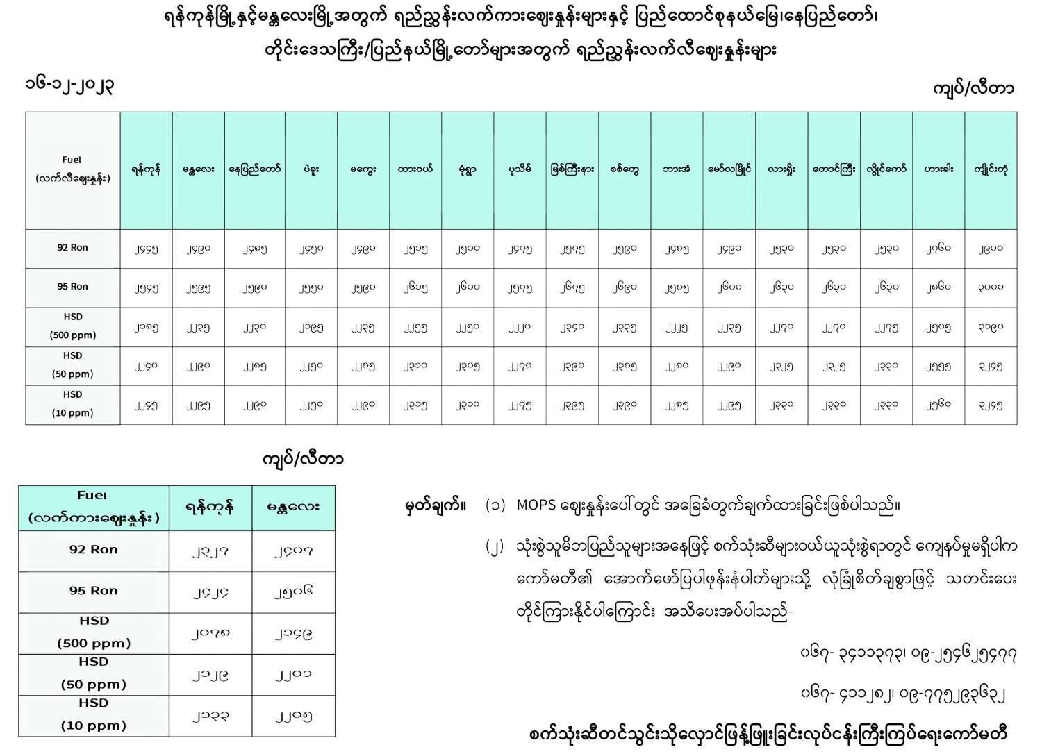 ရန်ကုန်မြို့နှင့် မန္တလေးမြို့အတွက် ရည်ညွှန်းလက်ကားဈေးနှုန်းများနှင့် ပြည်ထောင်စုနယ်မြေ နေပြည်တော်၊ တိုင်းဒေသကြီး/ပြည်နယ် မြို့တော်များအတွက် ရည်ညွှန်းလက်လီဈေးနှုန်းများ 12/16/2023