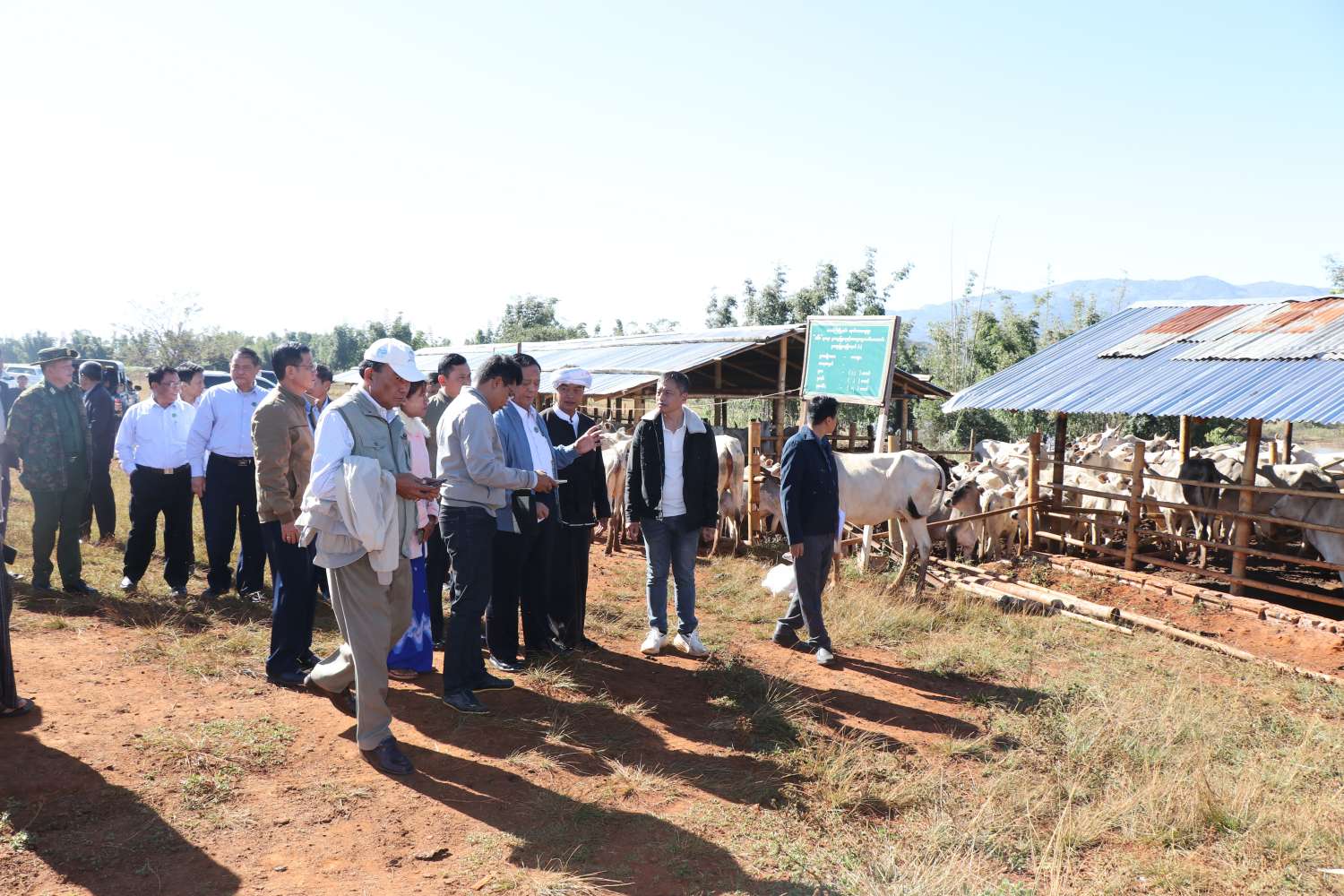 ထို့နောက် ပြည်ထောင်စုဝန်ကြီး၊ ပြည်နယ်ဝန်ကြီးချုပ်နှင့်အဖွဲ့သည် တောင်ကြီးမြို့နယ်၊ နောင်ကားကျေးရွာ၌ “ခမ်း” ရတနာနွားမွေးမြူရေးနှင့် အထွေထွေသမဝါယမအသင်း၏ နိုင်ငံ့စီးပွားမြှင့်တင်ရေးရန်ပုံငွေဖြင့် ခြံလှောင်စနစ်ဖြင့် ဒေသနွားမွေးမြူရေးလုပ်ငန်းဆောင်ရွက်နေမှုကို ကြည့်ရှုစစ်ဆေးပြီး သမဝါယမအသင်းများဖွဲ့စည်းကာ စိုက်ပျိုးရေး၊ မွေးမြူရေးနှင့် အခြားကုန်ထုတ်လုပ်ငန်းများ စုပေါင်းဆောင်ရွက်ကြရန်မှာကြားကာ နိုင်ငံ့စီးပွားမြှင့်တင်ရေးရန်ပုံငွေဖြင့် ဆောင်ရွက်ထားသည့် ခြံလှောင်စနစ်ဖြင့် စုပေါင်းနွားမွေးမြူထားရှိမှုကို ကြည့်ရှုစစ်ဆေးသည်။