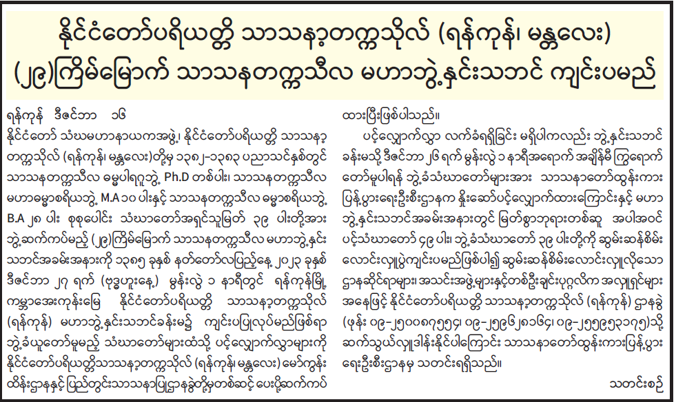 နိုင်ငံတော်ပရိယတ္တိသာသနာ့တက္ကသိုလ် (ရန်ကုန်၊ မန္တလေး) (၂၉) ကြိမ်မြောက် သာသနတက္ကသီလ မဟာဘွဲ့နှင်းသဘင် ကျင်းပမည် 12/17/2023
