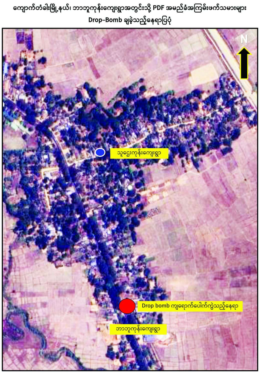 ယနေ့တွင်လည်း PDF အမည်ခံ အကြမ်းဖက်သမားများက ပဲခူးတိုင်းဒေသကြီး ကျောက်တံခါးမြို့နယ် ဘာဘူကုန်းကျေးရွာအတွင်းသို့ ကျေးရွာ၏ မြောက်ဘက် သုံးမိုင်ခန့်အကွာ အမြင့် မီတာ ၅၀၀ ခန့်မှနေ၍ Drop Bomb ဖြင့် နှစ်ကြိမ်ပစ်ချတိုက်ခိုက်ခဲ့ရာ ကျေးရွာအတွင်း Drop Bomb များ ကျရောက်ပေါက်ကွဲခဲ့ပြီး အဆိုပါကျေးရွာနေ အပြစ်မဲ့ပြည်သူ အသက် (၆) နှစ်အရွယ် ကလေးငယ်တစ်ဦးအပါအဝင် အပြစ်မဲ့ပြည်သူလေးဦး ဗုံးစ ထိမှန်ဒဏ်ရာများ ရရှိခဲ့သည်။