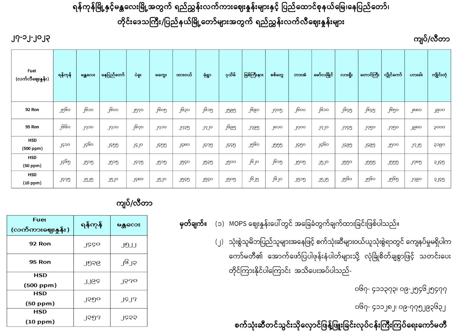 ရန်ကုန်မြို့နှင့် မန္တလေးမြို့အတွက် ရည်ညွှန်းလက်ကားဈေးနှုန်းများနှင့် ပြည်ထောင်စုနယ်မြေ နေပြည်တော်၊ တိုင်းဒေသကြီး/ပြည်နယ် မြို့တော်များအတွက် ရည်ညွှန်းလက်လီဈေးနှုန်းများ 12/27/2023