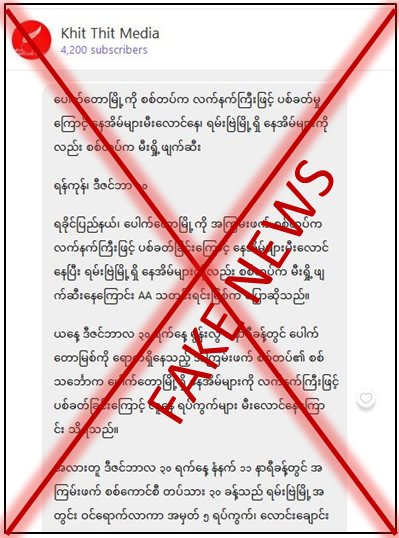 ရခိုင်ပြည်နယ်၊ ပေါက်တောမြို့ကို တပ်မတော်က လက်နက်ကြီးဖြင့် ပစ်ခတ်ခြင်းကြောင့် နေအိမ်များမီးလောင်နေပြီး ရမ်းဗြဲမြို့ရှိ နေအိမ်များကိုလည်း တပ်မတော်က မီးရှို့ဖျက်ဆီးနေကြောင်း တရားမဝင်မီဒီယာတစ်ခုဖြစ်သည့် Khit Thit Media က သတင်းတု၊ သတင်းအမှားများကို လူမှုကွန်ရက်စာမျက်နှာပေါ်တွင် ရေးသားဖြန့်ဝေလျက်ရှိသည်ကို တွေ့ရှိရသည်။