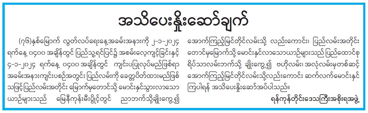 (၇၆) နှစ်မြောက် လွတ်လပ်ရေးနေ့အခမ်းအနားကို ၂-၁-၂၀၂၄ ရက်နေ့ ၀၄၀၀ အချိန်တွင် ပြည်သူ့ရင်ပြင်၌ အစမ်းလေ့ကျင့်ခြင်းနှင့် ၄-၁-၂၀၂၄ ရက်နေ့ ၀၄၀၀ အချိန်တွင် ကျင်းပပြုလုပ်မည်ဖြစ်ရာ အခမ်းအနားကျင်းပစဉ်အတွင်း ပြည်လမ်းကို ခေတ္တပိတ်ထားမည်ဖြစ်သဖြင့် ပြည်လမ်းအတိုင်း မြောက်မှတောင်သို့ မောင်းနှင်သွားလာသော ယာဉ်များသည် မြေနီကုန်းမီးပွိုင့်တွင် ညာဘက်သို့ချိုးကွေ့၍ အောက်ကြည့်မြင်တိုင်လမ်းသို့လည်းကောင်း၊ ပြည်လမ်းအတိုင်း တောင်မှမြောက်သို့ မောင်းနှင်လာသောယာဉ်များသည် ပြည်ထောင်စုရိပ်သာလမ်းဘက်သို့ချိုးကွေ့၍ ဗဟိုလမ်း၊ အလုံလမ်းမှတစ်ဆင့် အောက်ကြည့်မြင်တိုင်လမ်းသို့လည်းကောင်း ဆက်လက်မောင်းနှင်ကြပါရန် အသိပေးနှိုးဆော်အပ်ပါသည်။