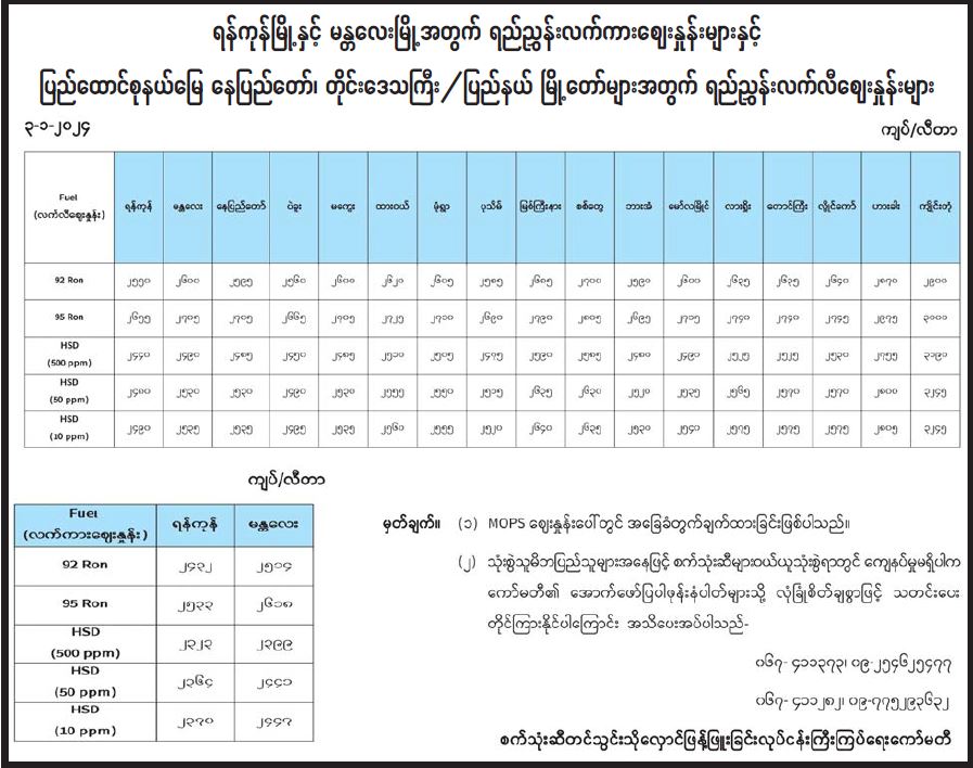 ရန်ကုန်မြို့နှင့် မန္တလေးမြို့အတွက် ရည်ညွှန်းလက်ကားဈေးနှုန်းများနှင့် ပြည်ထောင်စုနယ်မြေ နေပြည်တော်၊ တိုင်းဒေသကြီး/ပြည်နယ် မြို့တော်များအတွက် ရည်ညွှန်းလက်လီဈေးနှုန်းများ 01/03/2024