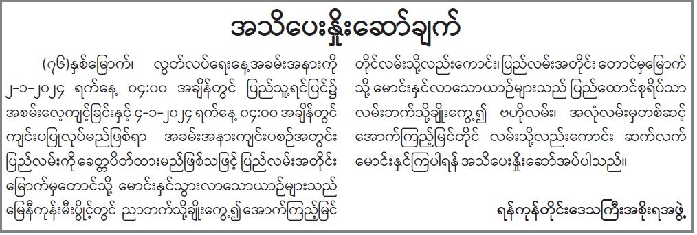 ရန်ကုန်မြို့နှင့် မန္တလေးမြို့အတွက် ရည်ညွှန်းလက်ကားဈေးနှုန်းများနှင့် ပြည်ထောင်စုနယ်မြေ နေပြည်တော်၊ တိုင်းဒေသကြီး/ပြည်နယ် မြို့တော်များအတွက် ရည်ညွှန်းလက်လီဈေးနှုန်းများ