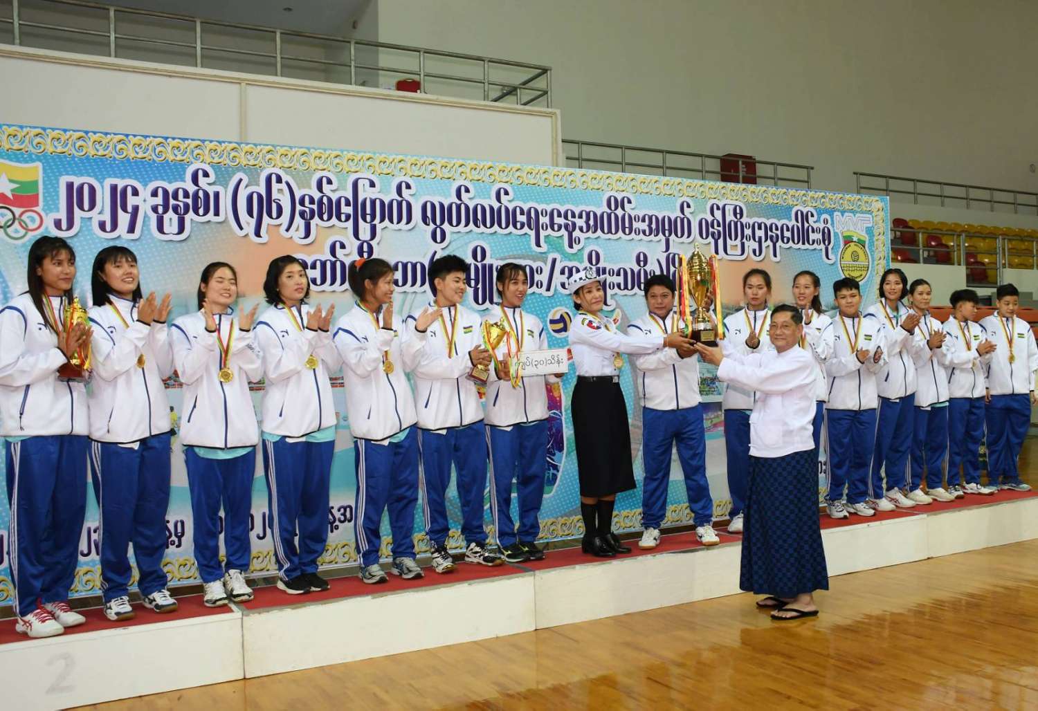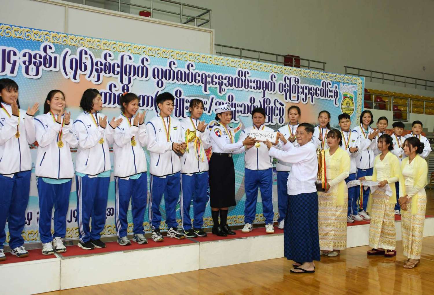 ယင်းနောက် နိုင်ငံတော်စီမံအုပ်ချုပ်ရေးကောင်စီအဖွဲ့ဝင် ဒေါက်တာဘရွှေ က အမျိုးသမီးဘော်လီဘောပြိုင်ပွဲတွင် ပထမဆုရရှိသည့် ပြည်ထဲရေးဝန်ကြီးဌာနအသင်းအား တစ်ဦးချင်း ဂုဏ်ပြုဆုတံဆိပ်များ၊ ဂုဏ်ပြုဆုငွေများနှင့်အတူ တံခွန်စိုက်ဆုဖလားကို ပေးအပ်ချီးမြှင့်သည်။