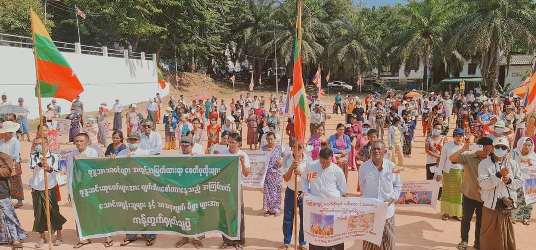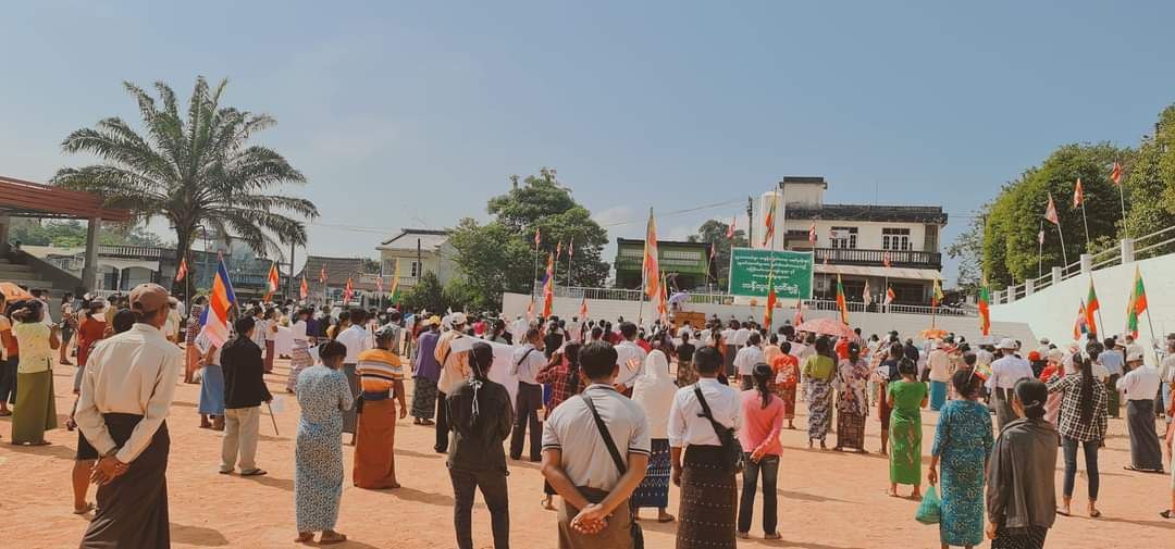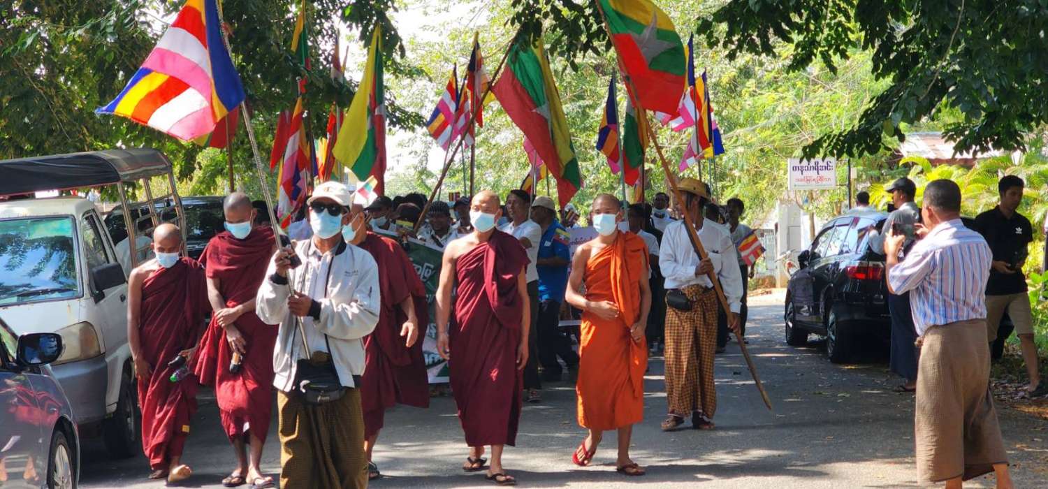 အဆိုပါရှုတ်ချပွဲတွင် ဆရာတော်သံဃာတော်များနှင့် ပြည်သူစုစုပေါင်း (၂၀၀) ဦးခန့်က “သာသနာကို ဖျက်ဆီးနေသော အကြမ်းဖက်သူပုန်များအားရှင်းလင်းရေး” ၊ “ဗုဒ္ဓသာသနာအားစော်ကားဖျက် စီးနေသော အကြမ်းဖက်သူပုန်မှန်သမျှ ဆန့်ကျင်ကြ” ၊ “ဘုရားစေတီများအား ဖျက်ဆီးနေသည့် လူသတ်အကြမ်းဖက် သူပုန်မှန်သမျှ ကျဆုံးပါစေ” စသည့် စာသားများပါဝင်သည့် ဗီနိုင်းများကိုင်ဆောင်၍ ကြွေးကြော်ကာ ကန့်ကွက်ရှုတ်ချခဲ့ကြသည်။