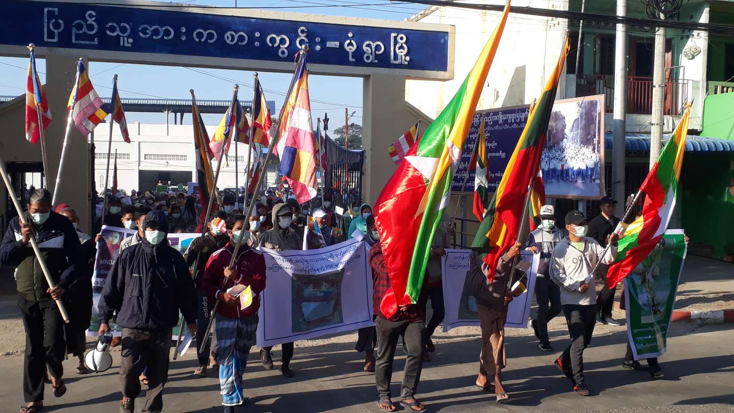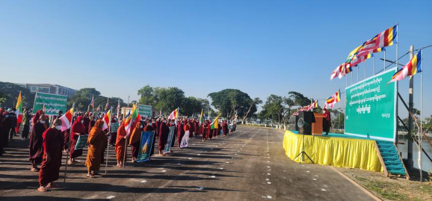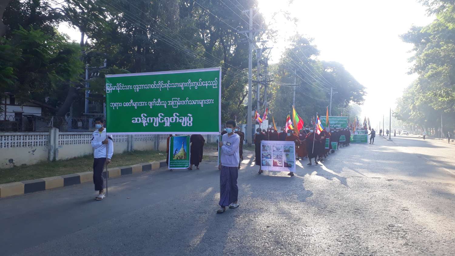 ဆရာတော်သံဃာတော်များနှင့် ပြည်သူစုစုပေါင်း (၇၀၀) ဦးခန့်က မုံရွာမြို့ ပြည်သူ့အားကစားကွင်းရှေ့ ဗိုလ်ချုပ်လမ်းအတိုင်း အရှေ့ဘက်ကန်သာယာ ပြည်ထောင်စုကျွန်းအရောက် လှည့်လည်ကာ “သာသနာကို ဖျက်ဆီးနေသော အကြမ်းဖက်သူပုန်များအား ရှင်းလင်းရေး” ၊ “ဗုဒ္ဓသာသနာအား စော်ကားဖျက်စီးနေသော အကြမ်းဖက်သူပုန်မှန်သမျှ ဆန့်ကျင်ကြ” ၊ “ဘုရားစေတီများအား ဖျက်ဆီးနေသည့် လူသတ်အကြမ်းဖက်သူပုန်မှန်သမျှ ကျဆုံးပါစေ” စသည့် စာသားများပါဝင်သည့် ဗီနိုင်းများကိုင်ဆောင်၍ ကြွေးကြော်ကာ ကန့်ကွက်ရှုတ်ချခဲ့ကြသည်။