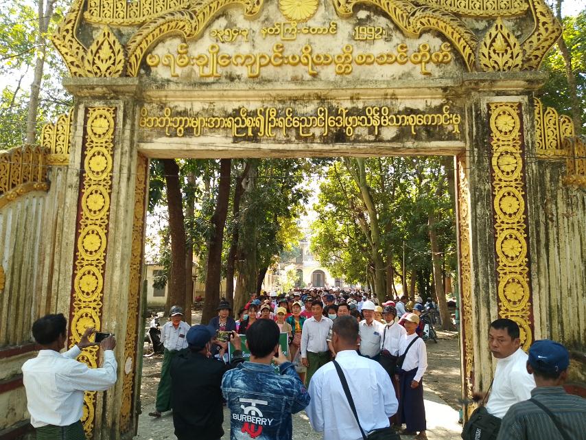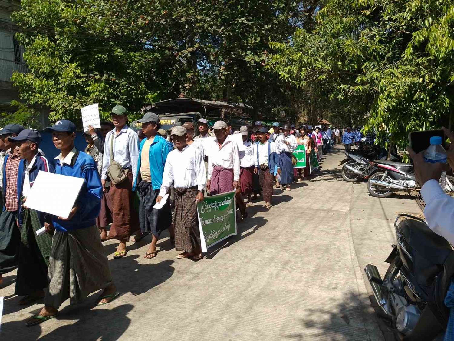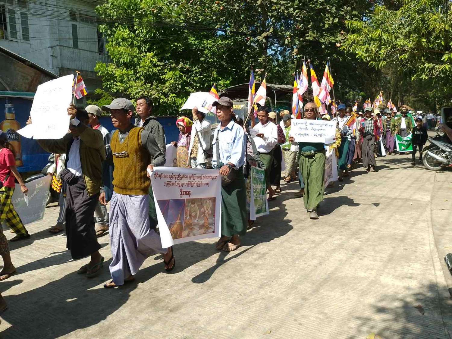 အဆိုပါ ကန့်ကွက်ရှုတ်ချပွဲတွင် သံဃာတော်များနှင့် ဒေသခံပြည်သူ (၁၀၀၀) ကျော်တို့က အမှတ် (၅) ရပ်ကွက်၊ ဖက်တန်းလမ်း၊ မရမ်းချိုဘုန်းတော်ကြီးကျောင်းရှေ့မှစတင်၍ ဗုဒ္ဓဘာသာကို စော်ကားဖျက်စီးနေကြသည့် မိစ္ဆာများအား (ဆန့်ကျင်ကြ-ဆန့်ကျင်ကြ)၊ စေတီပုထိုးနှင့် ဗုဒ္ဓဆင်းတုတော်များအား ဖျက်ဆီးနေကြသည့် အကြမ်းဖက်သမားများနှင့် သာသနာဖျက်များအား (ဆန့်ကျင်ကြ-ဆန့်ကျင်ကြ)၊ ဒို့ဘာသာ ဒို့သာသနာ ဒို့ယဉ်ကျေးမှု ဖျက်ဆီးစော်ကားသူများအား (ဆန့်ကျင်ကြ-ဆန့်ကျင်ကြ)၊ အကြမ်းဖက်အားပေးလောက်ကောင်များအား (အလိုမရှိ-အလိုမရှိ)၊ သာသနာဖျက်အကြမ်းဖက်သမားများအား (အလိုမရှိ-အလိုမရှိ)၊ ဗုဒ္ဓသာသနာကို ဖျက်ဆီးစော်ကားနေသည့် အကြမ်းဖက်သမားများ (ကျဆုံးပါစေ-ကျဆုံးပါစေ)၊ စေတီပုထိုးဆင်းတုတော်များအား ဖျက်ဆီးနေသည့် အကြမ်းဖက်မိစ္ဆာများ (ကျဆုံးပါစေ-ကျဆုံးပါစေ) စသည့်စာသားများပါ ဆိုင်းဘုတ်များနှင့် သာသနာ့အလံများ ကိုင်ဆောင်ကာ ကြွေးကြော်သံများကြွေးကြော်ပြီး မရမ်းချိုလမ်း၊ ရွှေစေတီလမ်း၊ ကမ်းနားလမ်းအတိုင်း စီတန်းလှည့်လည်ခဲ့ကြသည်။