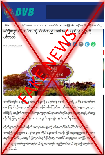 စစ်ကိုင်းတိုင်းဒေသကြီး၊ ခင်ဦးမြို့နယ်၊ ကျွန်းတောကြီးကျေးရွာ၊ မြင်းကျကျေးရွာနှင့် ကားဆိပ်ကျေးရွာတို့မှ ကိုယ်ဝန်သည်အမျိုးသမီးတစ်ဦးအပါအဝင် ပြည်သူ ၄ ဦးကို ဇန်နဝါရီ ၁၂ ရက်နေ့က လုံခြုံရေးတပ်ဖွဲ့ဝင်များက ပစ်သတ်သွားကြောင်း သတင်းတု၊ သတင်းအမှားများကို တရားမဝင်ပြည်ဖျက်မီဒီယာ DVB က လူမှုကွန်ရက်စာမျက်နှာများတွင် မဟုတ်မမှန်ရေးသားဖြန့်ဝေနေသည်ကို တွေ့ရှိရသည်။