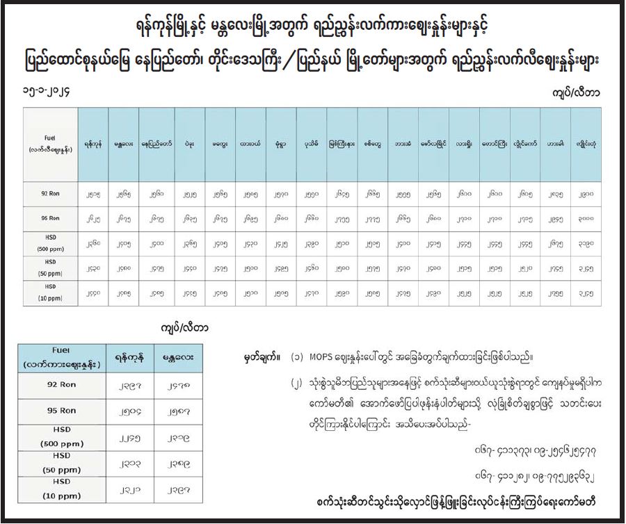 ရန်ကုန်မြို့နှင့် မန္တလေးမြို့အတွက် ရည်ညွှန်းလက်ကားဈေးနှုန်းများနှင့် ပြည်ထောင်စုနယ်မြေ နေပြည်တော်၊ တိုင်းဒေသကြီး/ပြည်နယ် မြို့တော်များအတွက် ရည်ညွှန်းလက်လီဈေးနှုန်းများ 01/15/2024