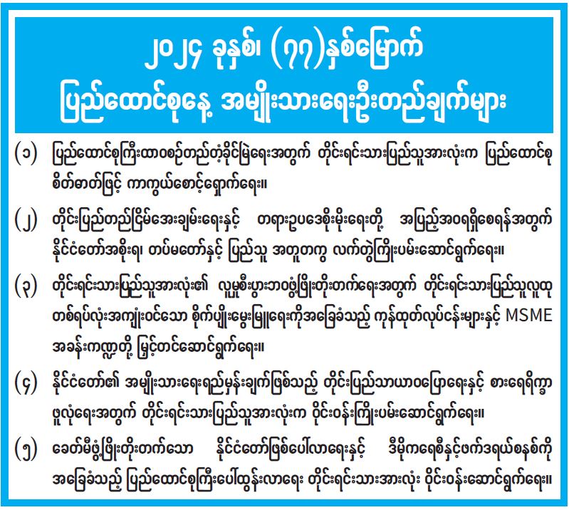 (၃) တိုင်းရင်းသားပြည်သူအားလုံး၏ လူမှုစီးပွားဘဝဖွံ့ဖြိုးတိုးတက်ရေးအတွက် တိုင်းရင်းသား ပြည်သူလူထုတစ်ရပ်လုံး အကျုံးဝင်သော စိုက်ပျိုးမွေးမြူရေးကို အခြေခံသည့် ကုန်ထုတ်လုပ်ငန်း များနှင့် MSME အခန်းကဏ္ဍတို့ မြှင့်တင်ဆောင်ရွက်ရေး။
