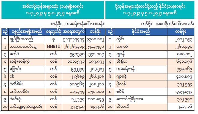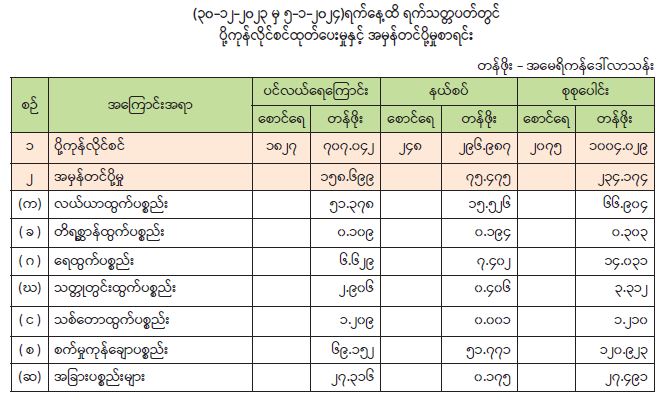 ၂၀၂၃-၂၀၂၄ ဘဏ္ဍာနှစ် ဒီဇင်ဘာ ၃၀ ရက်မှ ဇန်နဝါရီ ၅ ရက်အထိ ရက်သတ္တပတ်တွင် မြန်မာနိုင်ငံ၏ ပြည်ပပို့ကုန်တင်ပို့မှုတန်ဖိုး အမေရိကန်ဒေါ်လာ ၂၃၄ သန်းကျော် ရရှိခဲ့သည်။ ယခုရက်သတ္တပတ်တွင် လယ်ယာကဏ္ဍမှ ပြောင်း၊ ပဲစင်းငုံ၊ ကုလားပဲ၊ ထောပတ်ပဲ၊ မြေပဲဆန်၊ နှမ်း၊ ကြက်သွန်နီ၊ ချင်းခြောက်၊ မန်ကျည်းသီး၊ သစ်သီးဝလံ ဖရဲသီး၊ ထောပတ်သီး၊ လိမ္မော်သီး၊ တစ်သျှူးငှက်ပျောသီး၊ ငှက်ပျောသီး(ရိုးရိုး) တို့ တင်ပို့မှုပိုမိုခဲ့သည်။