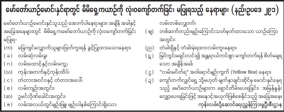မော်တော်ယာဉ်မောင်းနှင်ရာတွင် မိမိရှေ့ကယာဉ်ကို လုံးဝကျော်တက်ခြင်း မပြုရသည့် နေရာများ (နည်းဥပဒေ ၂၉၁) 01/15/2024