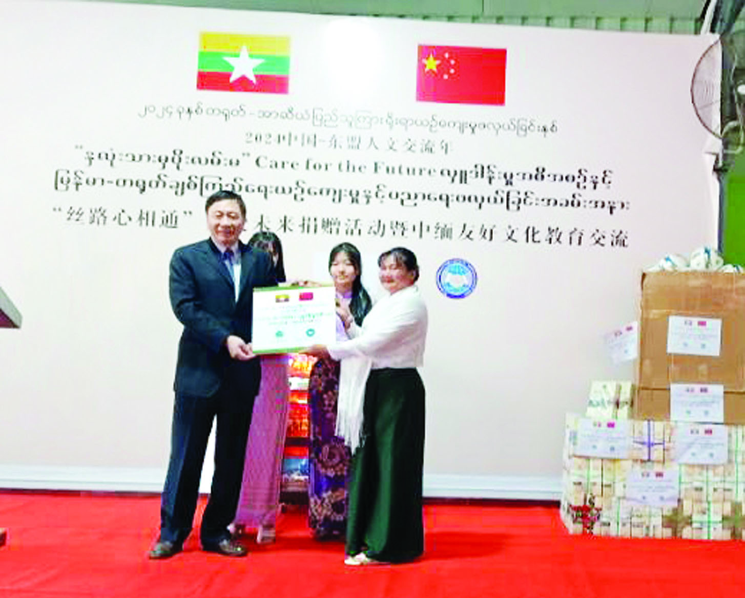 မြန်မာ-တရုတ် နှစ်နိုင်ငံချစ်ကြည်ရင်းနှီးမှု အထိမ်းအမှတ်အနေဖြင့်ကျင်းပသည့် နှလုံးသားမှပိုးလမ်းမ Care for the Future လှူဒါန်းမှုအစီအစဉ်နှင့် မြန်မာ-တရုတ် ချစ်ကြည်ရေးယဉ်ကျေးမှုနှင့် ပညာရေးဖလှယ်ခြင်း အခမ်းအနားကို ယနေ့နံနက် ၈ နာရီခွဲက ရန်ကုန်မြို့သင်္ဃန်းကျွန်းမြို့နယ် လေးထောင့်ကန်လမ်းမကြီးရှိ Myanmar Sports Hotel ဝင်းအတွင်း ရှိ MIEC ကျောင်း၌ ကျင်းပသည်။