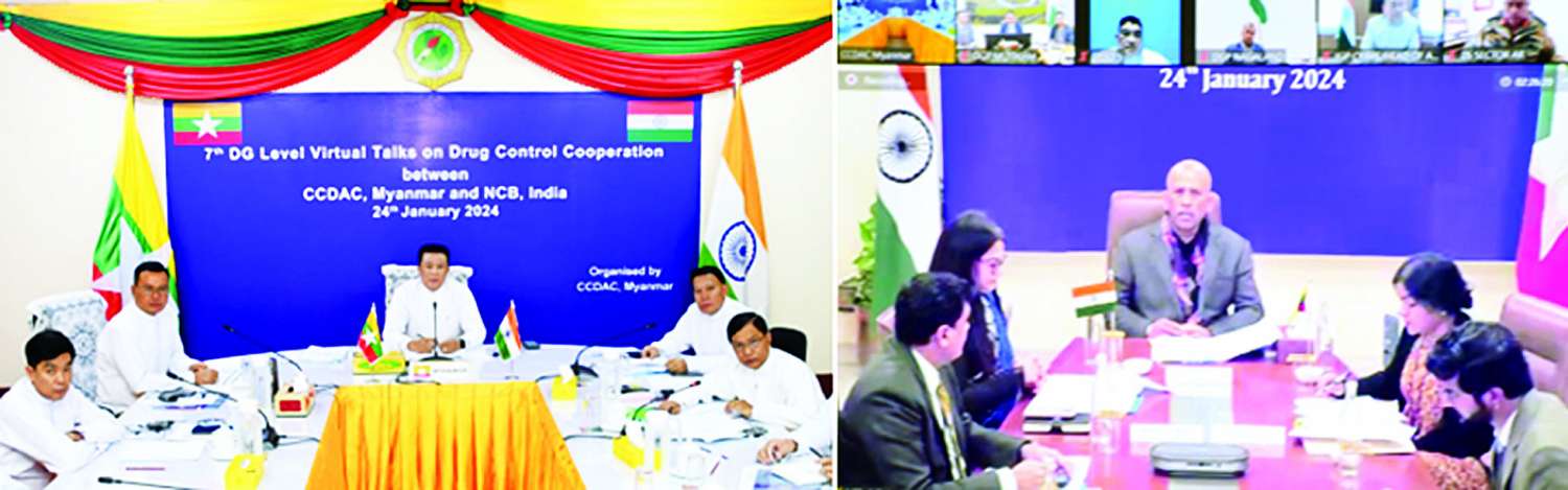(၇) ကြိမ်မြောက် မြန်မာ-အိန္ဒိယ နှစ်နိုင်ငံ မူးယစ်ဆေးဝါးပူးပေါင်းထိန်းချုပ်ရေး ညွှန်ကြားရေးမှူးချုပ် အဆင့်အစည်းအဝေးကို ယနေ့နံနက် ၁၁ နာရီတွင် မြန်မာနိုင်ငံမှ အလှည့်ကျအိမ်ရှင်အဖြစ် ကျင်းပရာ မြန်မာနိုင်ငံ မူးယစ်ဆေးဝါးနှင့်စိတ်ကိုပြောင်းလဲစေသော ဆေးဝါးများအန္တရာယ် တားဆီးကာကွယ်ရေးဗဟိုအဖွဲ့၊ တွဲဖက်အတွင်းရေးမှူး၊ မူးယစ်ဆေးဝါး တားဆီးနှိမ်နင်းရေးရဲတပ်ဖွဲ့၊ တပ်ဖွဲ့မှူး ရဲမှူးချုပ် ဝင်းနိုင် ဦးဆောင်သော ကိုယ်စားလှယ်အဖွဲ့သည် နေပြည်တော်ရှိ မူးယစ်ဆေးဝါးတားဆီးနှိမ်နင်းရေး ရဲတပ်ဖွဲ့မှူးရုံး အစည်းအဝေးခန်းမ၌ ဗီဒီယိုကွန်ဖရင့် စနစ်ဖြင့် တက်ရောက်သည်။