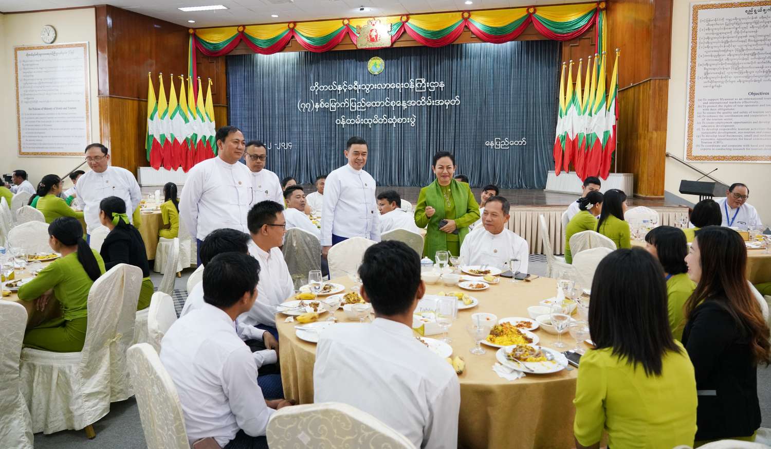 ထို့နောက် ပြည်ထောင်စုဝန်ကြီးသည် (၇၇) နှစ်မြောက် ပြည်ထောင်စုနေ့အထိမ်းအမှတ်အခမ်းအနားကို ဂုဏ်ပြုကြိုဆိုသောအားဖြင့် ဝန်ကြီးဌာန ကျောက်စိမ်းခန်းမ၌ ကျင်းပပြုလုပ်သည့် ဝန်ထမ်းထုမိတ်ဆုံစားပွဲသို့ တက်ရောက်၍ စနစ်တကျရှိခြင်းနှင့် စည်းစနစ်ကျနစွာ လုပ်ကိုင်ဆောင်ရွက်တတ်ခြင်းသည် ရုံးလုပ်ငန်းများ အောင်မြင်ရေးအတွက် အရေးကြီးသဖြင့် ကြိုးစားလေ့ကျင့်လုပ်ကိုင်ကြရမည်ဖြစ်ကြောင်းနှင့် အရည်အချင်းပြည့်ဝပြီး ဝန်ကြီးဌာနနှင့် နိုင်ငံ အကျိုးသယ်ပိုးနိုင်သော ဝန်ထမ်းကောင်းများဖြစ်အောင် လေ့လာသင်ယူသွားကြစေလိုကြောင်း တိုက်တွန်းပြောကြားပြီး ဝန်ကြီးဌာနမှ အရာထမ်း၊ အမှုထမ်းများနှင့်အတူ နေ့လယ်စာကို အတူတကွ သုံးဆောင်ခဲ့ကြောင်း သိရသည်။