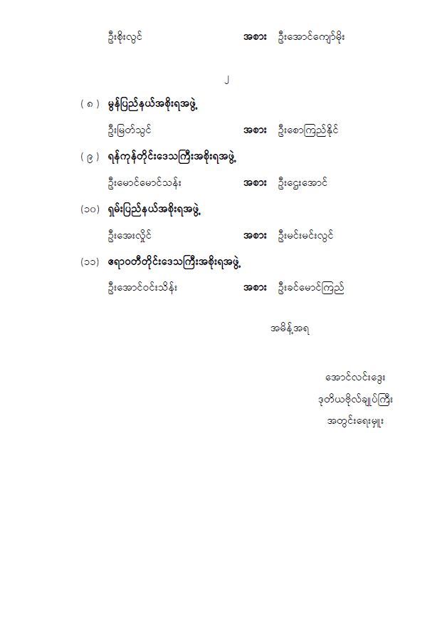 နိုင်ငံတော်စီမံအုပ်ချုပ်ရေးကောင်စီသည် ဖွဲ့စည်းပုံအခြေခံဥပဒေပုဒ်မ ၄၁၉ အရ အောက်ပါ နေပြည်တော်ကောင်စီဝင်နှင့် တိုင်းဒေသကြီးသို့မဟုတ် ပြည်နယ်အစိုးရအဖွဲ့၊ လူမှုရေးရာဝန်ကြီးများ အား ယှဉ်တွဲပါအတိုင်း အစားထိုးခန့်အပ်တာဝန်ပေးလိုက်သည်-