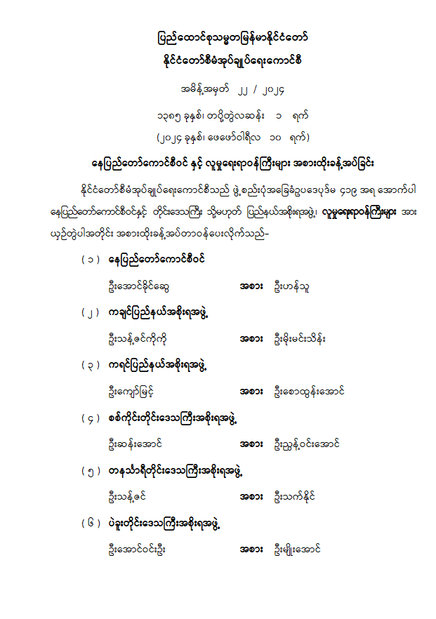 နေပြည်တော်ကောင်စီဝင်နှင့် လူမှုရေးရာဝန်ကြီးများ အစားထိုးခန့်အပ်ခြင်း
