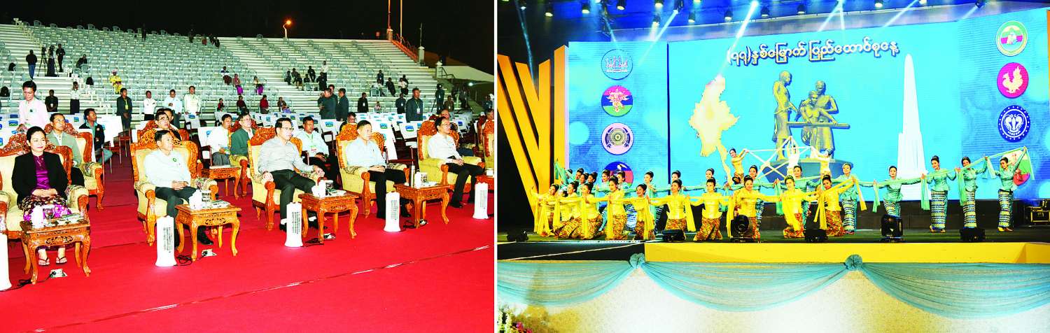 ထို့နောက် နိုင်ငံတော်စီမံအုပ်ချုပ်ရေးကောင်စီ ဒုတိယဥက္ကဋ္ဌ ဒုတိယဝန်ကြီးချုပ်သည် ၂၀၂၄ ခုနှစ် (၇၇) နှစ်မြောက် ပြည်ထောင်စုနေ့ဂုဏ်ပြုညစာစားပွဲ အခမ်းအနားအပြီးတွင် နေပြည်တော်မြို့တော်ခန်းမလဟာပြင် ကဇာတ်ရုံ၌ သီဆိုကပြဖျော်ဖြေတင်ဆက်ကြမည့် တိုင်းရင်းသား၊ တိုင်းရင်းသူများ၏ ဝတ်စုံပြည့်အစမ်းလေ့ကျင့် နေမှုများကို ကြည့်ရှုအားပေးပြီး အဆိုပါ ကပြဖျော်ဖြေကြသည့် အဖွဲ့များအား ဂုဏ်ပြုပန်းခြင်းများပေးအပ်ကာ ရင်းရင်းနှီးနှီးလိုက်လံနှုတ်ဆက်ကြသည်။