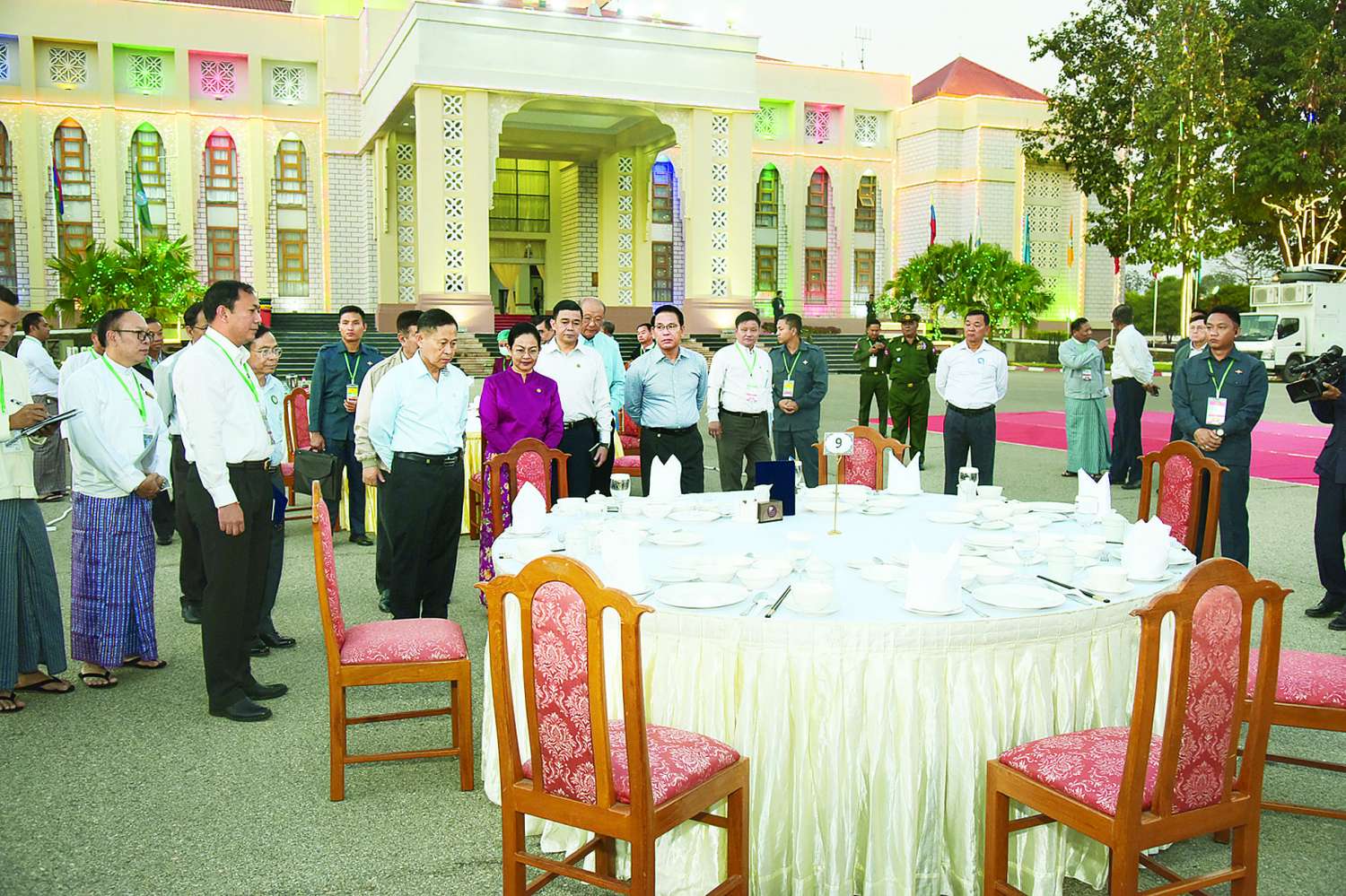 ညနေပိုင်းတွင် နိုင်ငံတော်စီမံအုပ်ချုပ်ရေးကောင်စီ ဒုတိယဥက္ကဋ္ဌ ဒုတိယဝန်ကြီးချုပ်သည် နေပြည်တော်မြို့တော်ခန်းမဥပစာရင်ပြင်၌ကျင်းပမည့် ၂၀၂၄ ခုနှစ် (၇၇) နှစ်မြောက်ပြည်ထောင်စုနေ့ ဂုဏ်ပြုညစာစားပွဲ အခမ်းအနား ခင်းကျင်းပြင်ဆင်ထားရှိမှုများကို ကြည့်ရှုစစ်ဆေးရာ တာဝန်ရှိသူများက လိုက်လံရှင်းလင်းပြသကြသည်။
